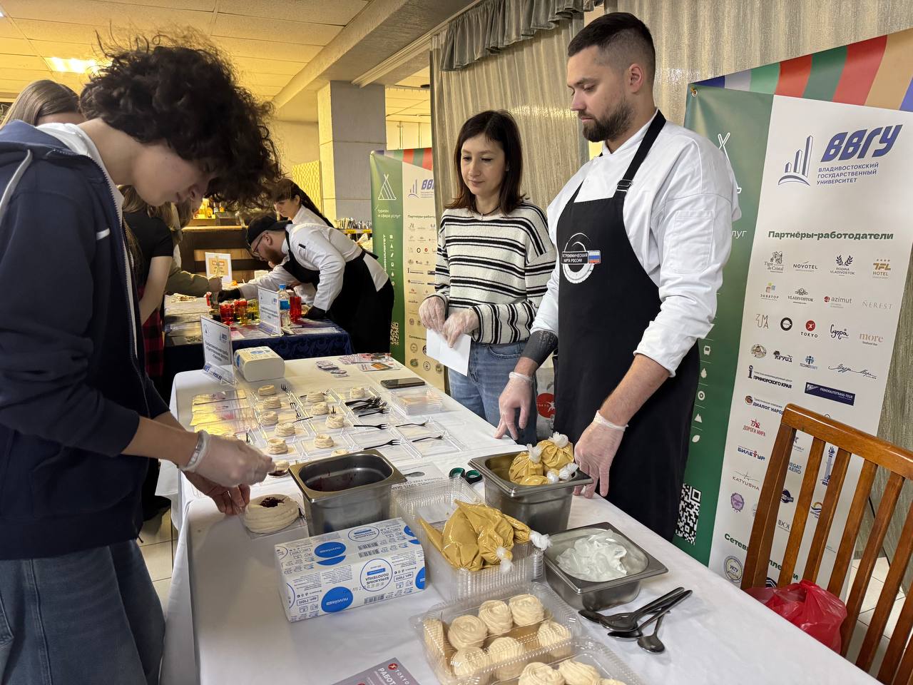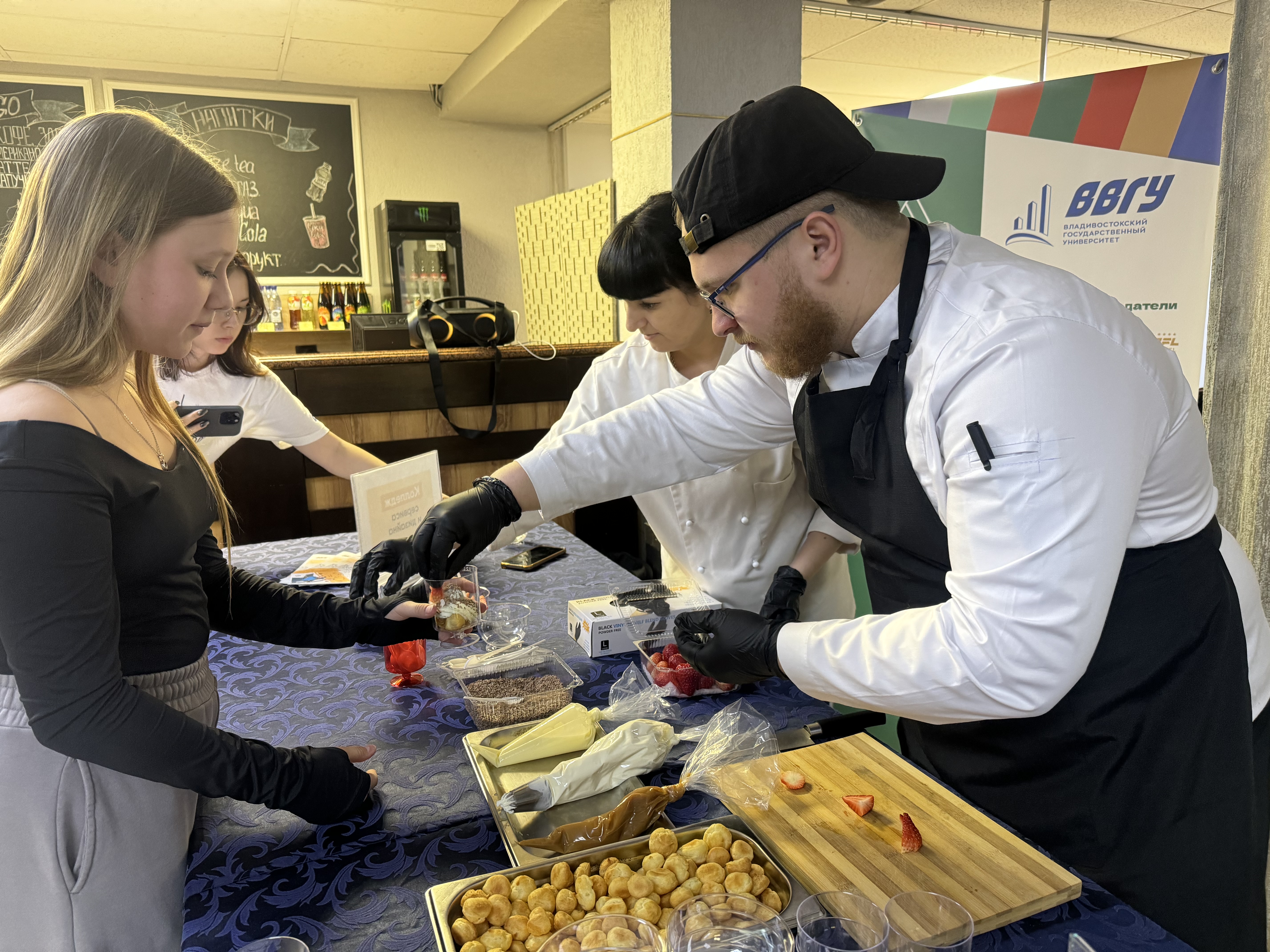 Студент ВВГУ Арсений Морозов, получивший гран-при в конкурсе Европейской кухни в Харбине, вместе с преподавателем-наставником, экспертом по компетенции «Поварское дело» Натальей Шекеро провели профессиональную пробу по кондитерскому искусству «Пирожное «Шу»: приготовили со школьниками десерт и рассказали, как правильно его подавать. Помимо этого, ребята научились готовить вкусные канапе и навсегда влюбились в индустрию гастрономии!