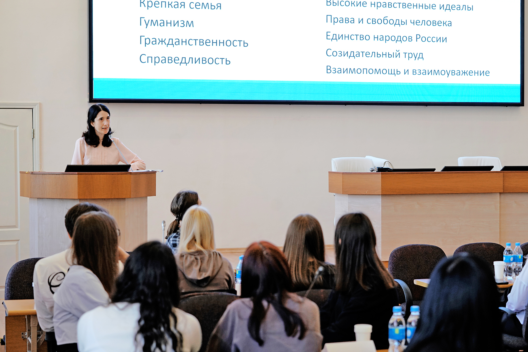 В начале встречи участники мероприятия – будущие учителя – познакомились с понятием «духовно-нравственные ценности», что позволит им в дальнейшей работе разговаривать со своими учениками на простом и понятном языке о том, что является основой развития детей, молодежи и всех граждан нашей страны.