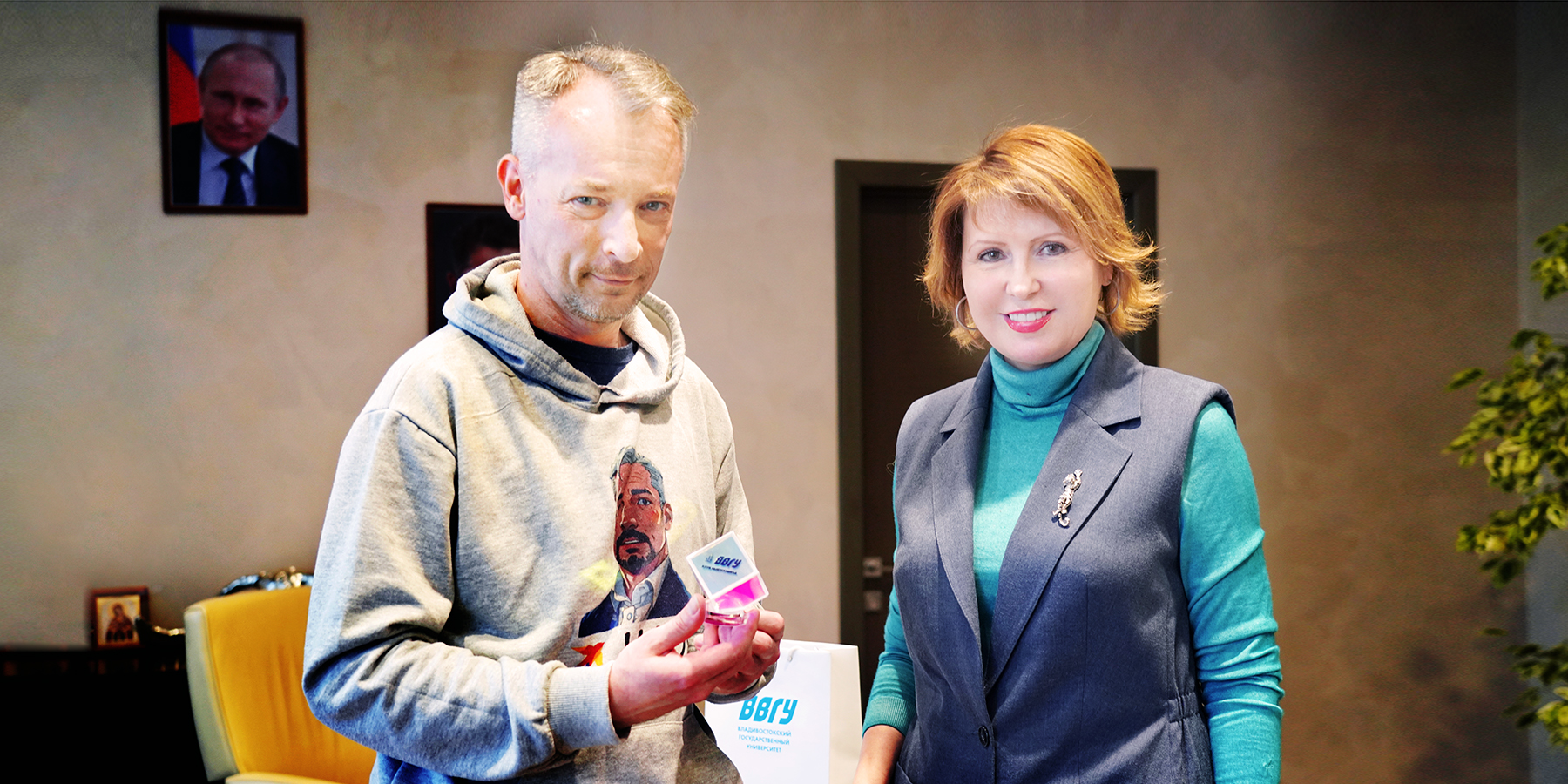 На фото: ректор ВВГУ Татьяна Терентьева вручает памятный знак-кубок выпускнику университета 2003 года (Институт международного бизнеса, экономики и управления), программному директору радио «Комсомольская правда — Приморье» Илье Кузнецову.