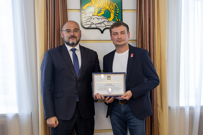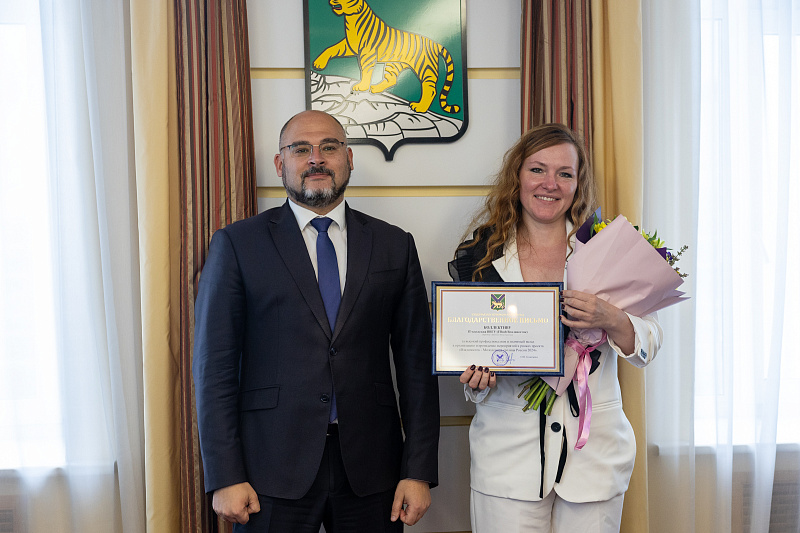 Константин Шестаков также вручил Благодарственные письма Губернатора Приморского края другим ключевым представителям ВВГУ, чей профессионализм и личный вклад были отмечены в организации мероприятий Молодёжной столицы: Алексею Бусыгину, начальнику управления молодёжной политики ВВГУ, Юлии Кравченко, директору Колледжа информационных и креативных технологий ВВГУ.