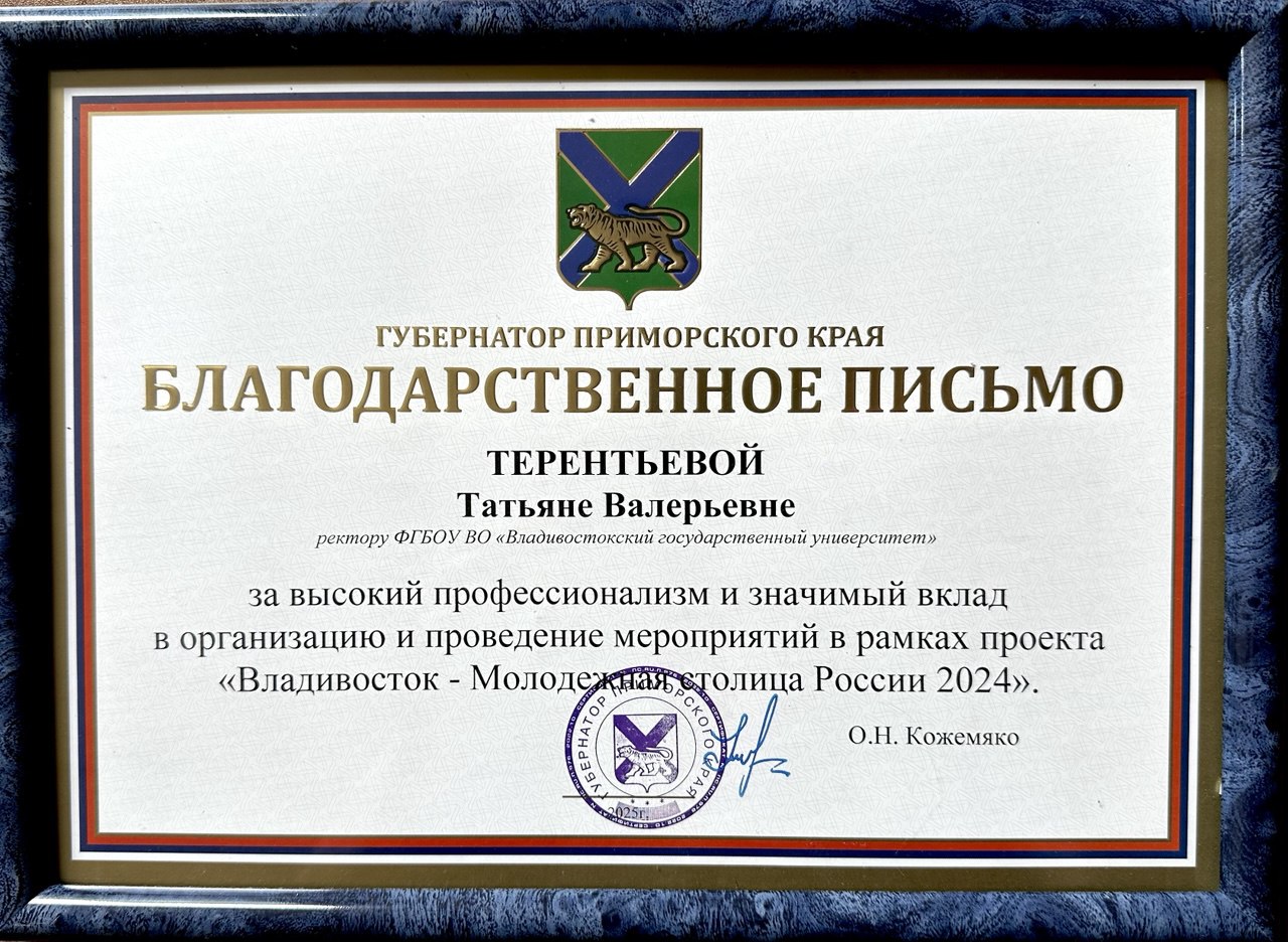 Значительный вклад ВВГУ в успех проекта «Владивосток – Молодёжная столица России 2024» получил высокую оценку на региональном уровне. Ректор ВВГУ доктор экономических наук, профессор Татьяна Терентьева награждена Благодарственным письмом Губернатора Приморского края Олега Кожемяко.