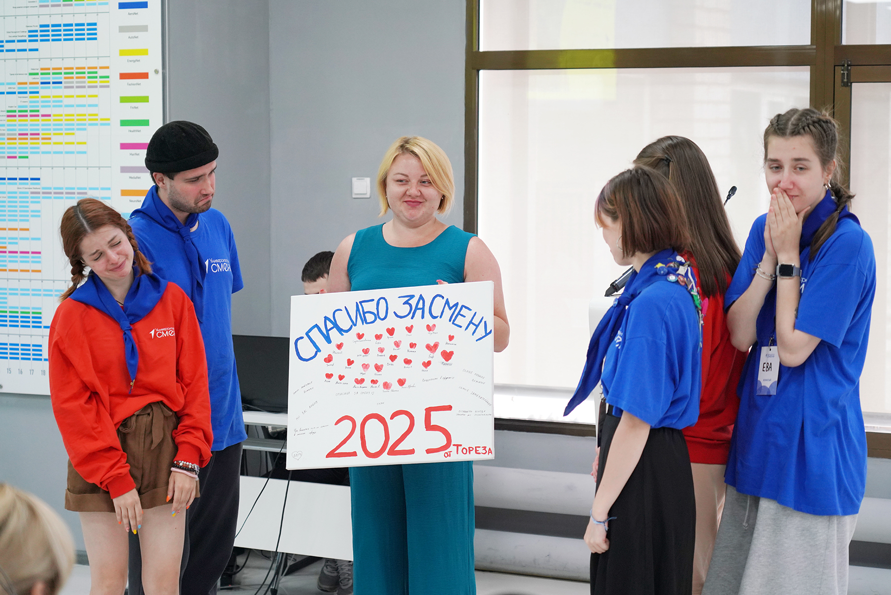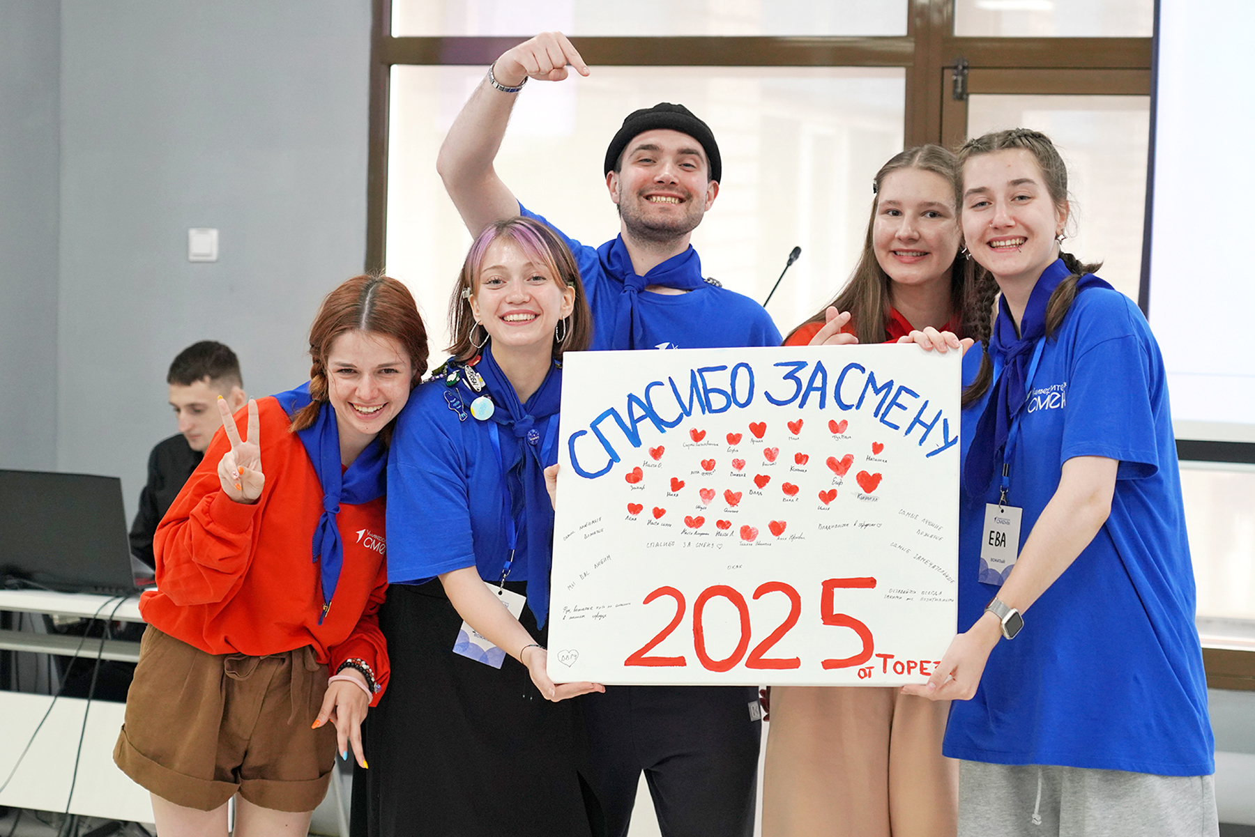 На память от всех детей вожатым вручили картину. На ней изображены сердечки, которые ребята оставили своим кураторам.![]()