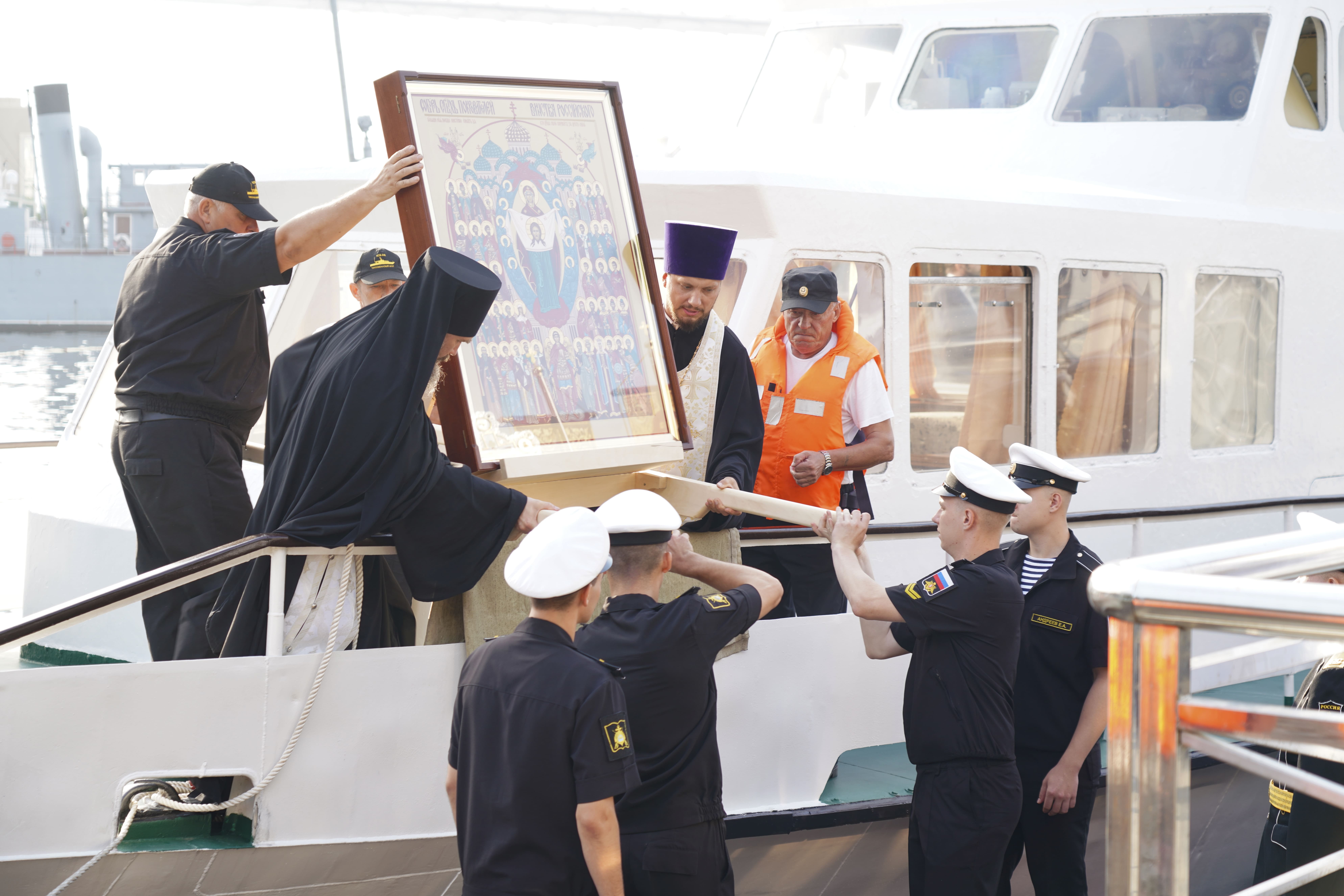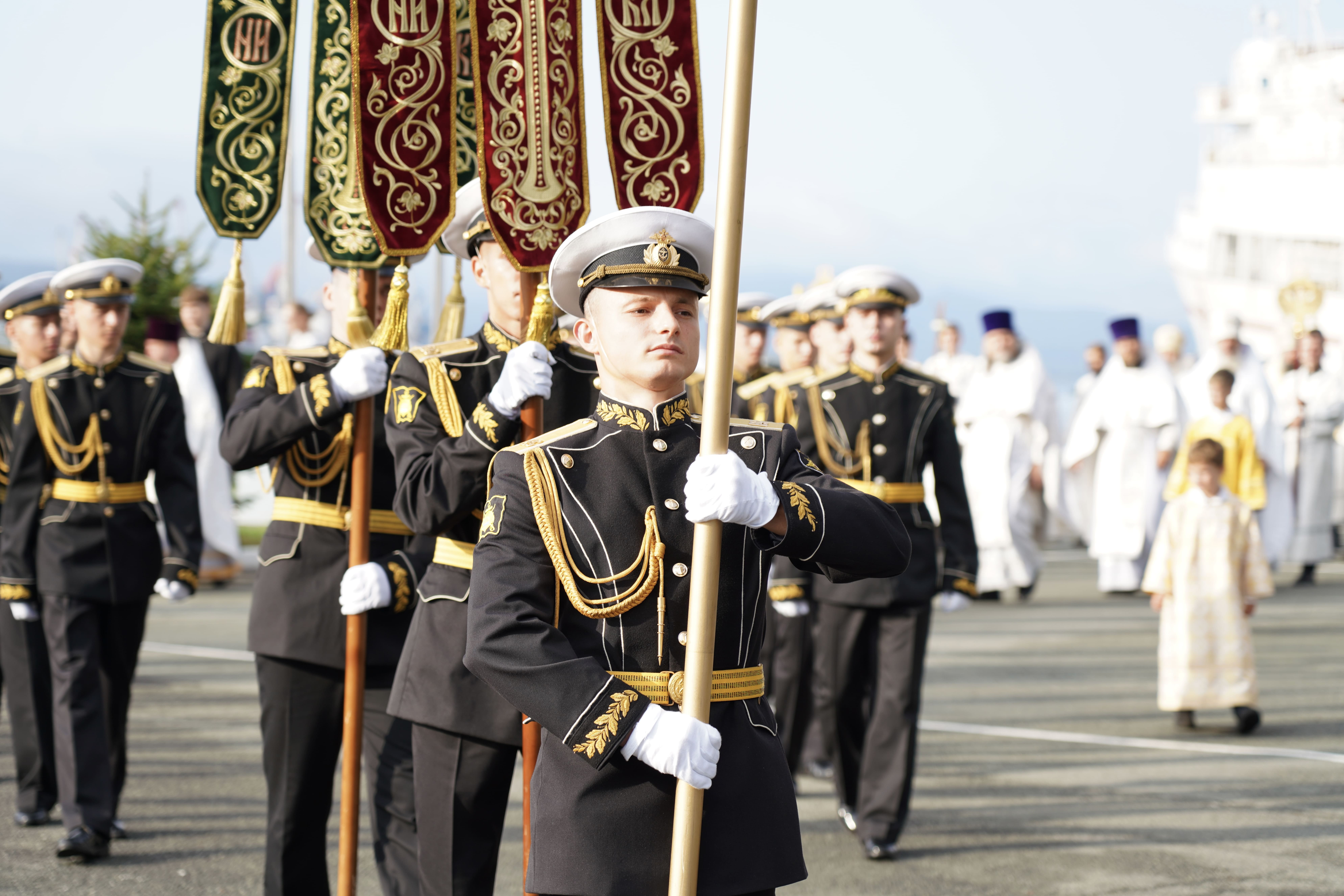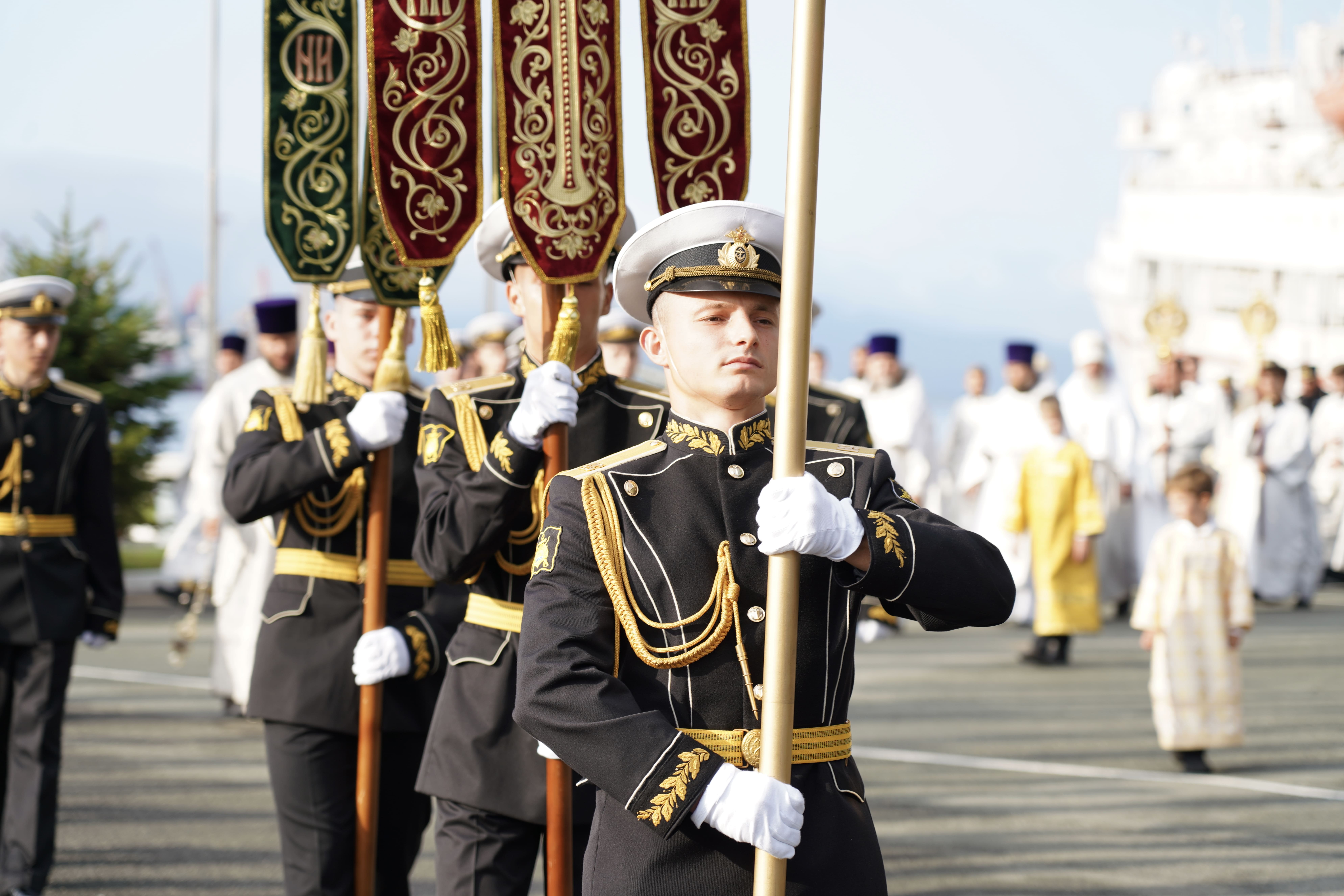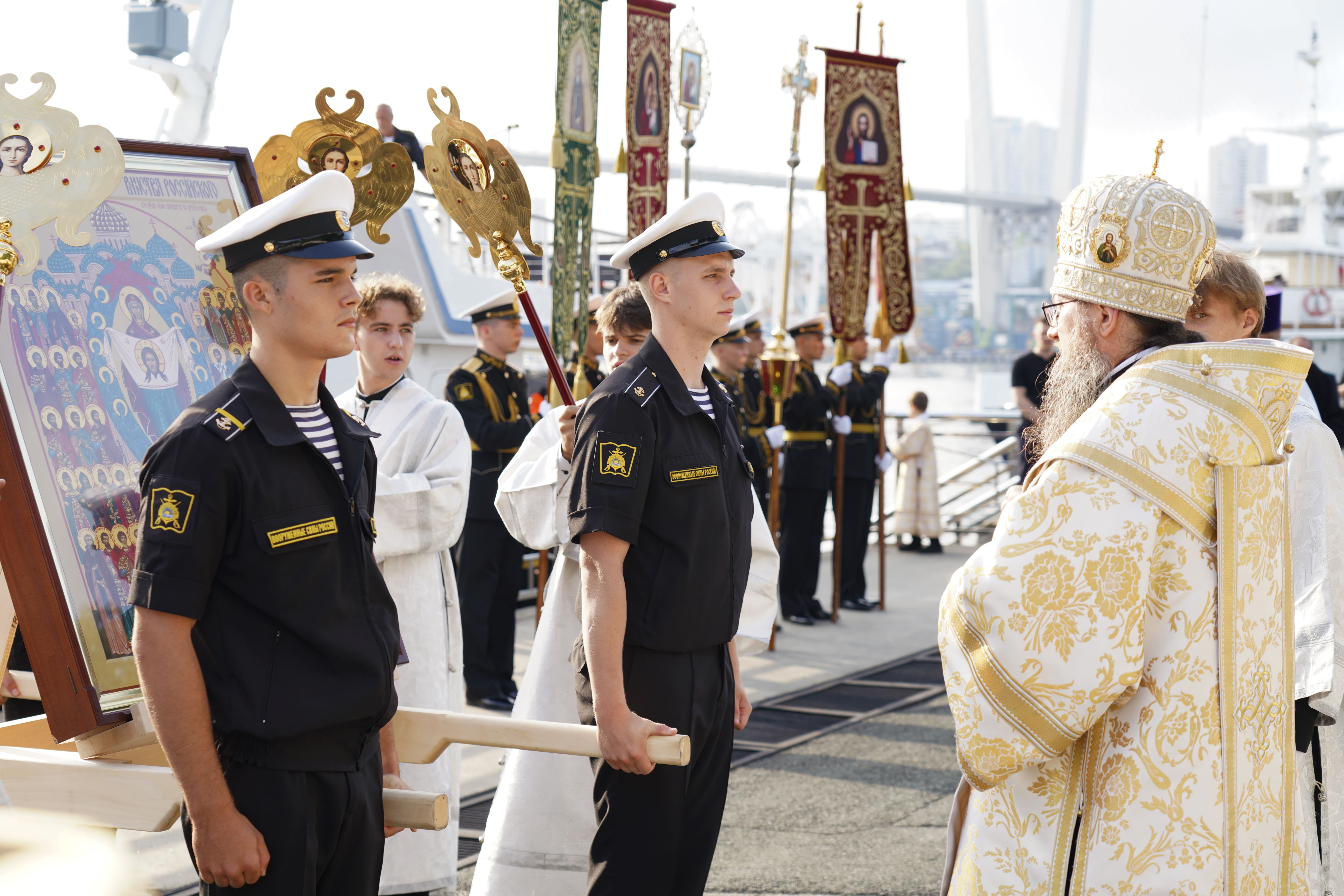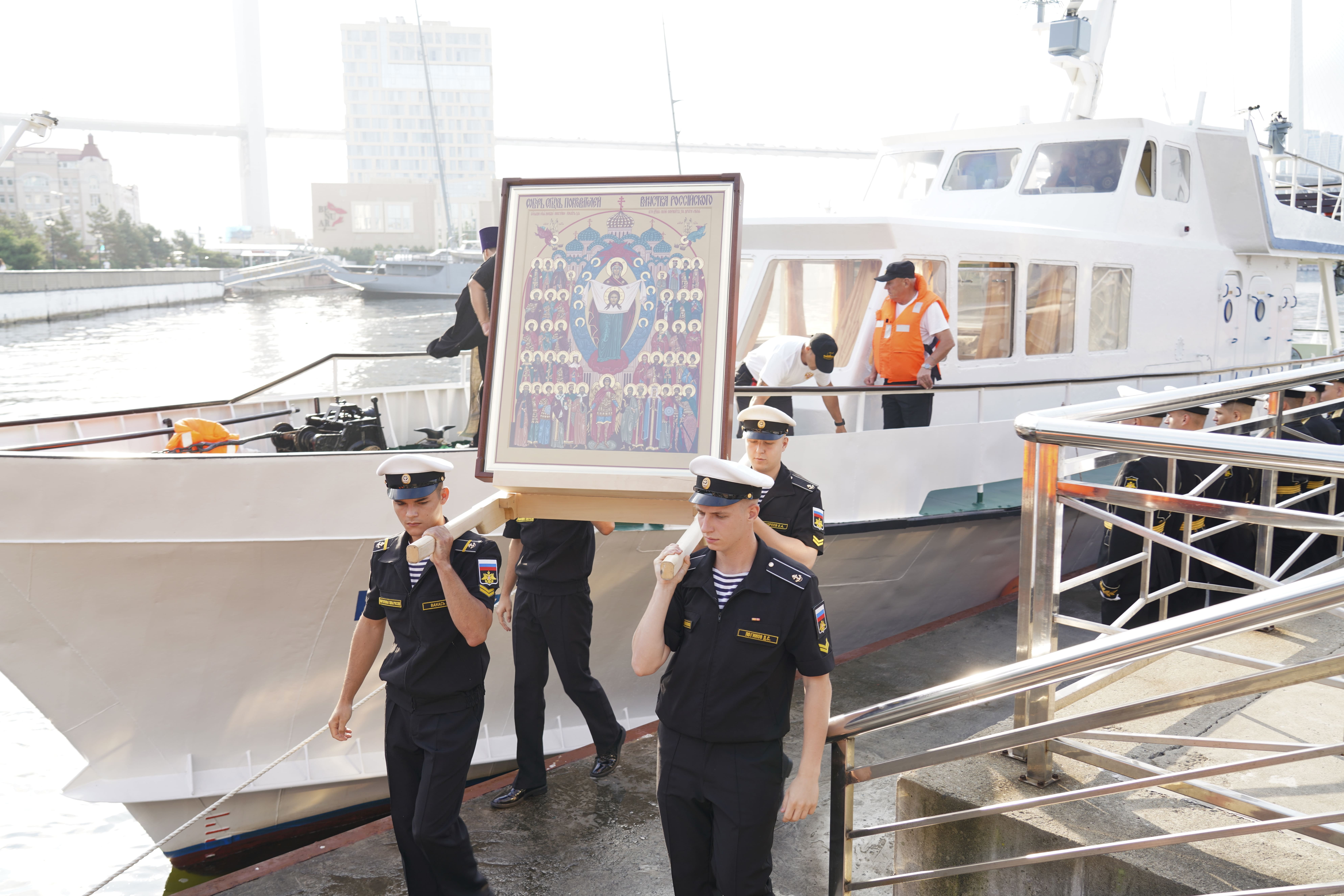 На причале торжественно встретили икону, которая прибыла на катере из Храма Серафима Саровского (остров Русский). Дань традиции отдали моряки ТОФ и курсанты военно-учебного центра ВВГУ. После церемонии иконопочитания участники направились в Спасо-Преображенский кафедральный собор, где состоялась Божественная литургия и молебен о русском воинстве.