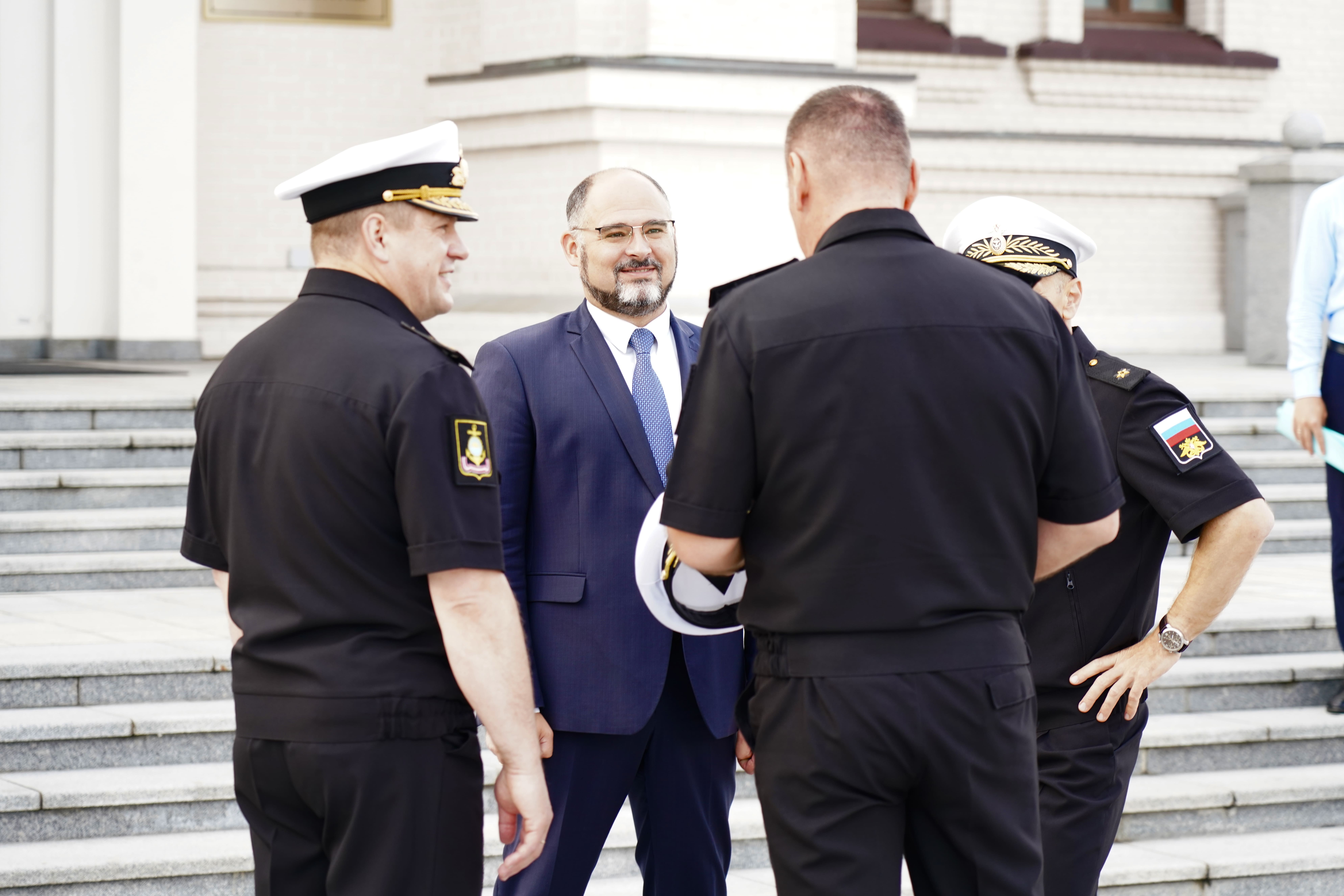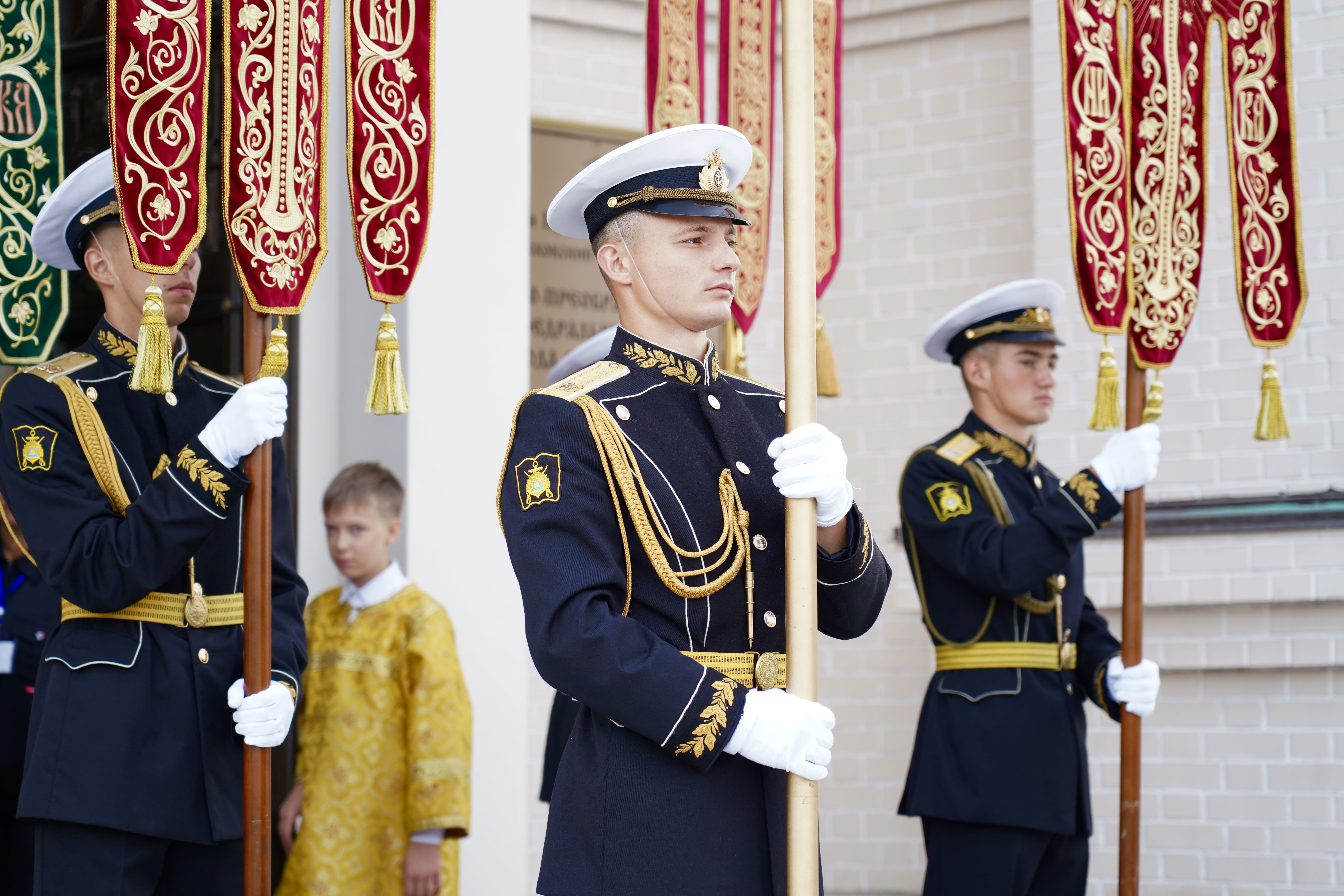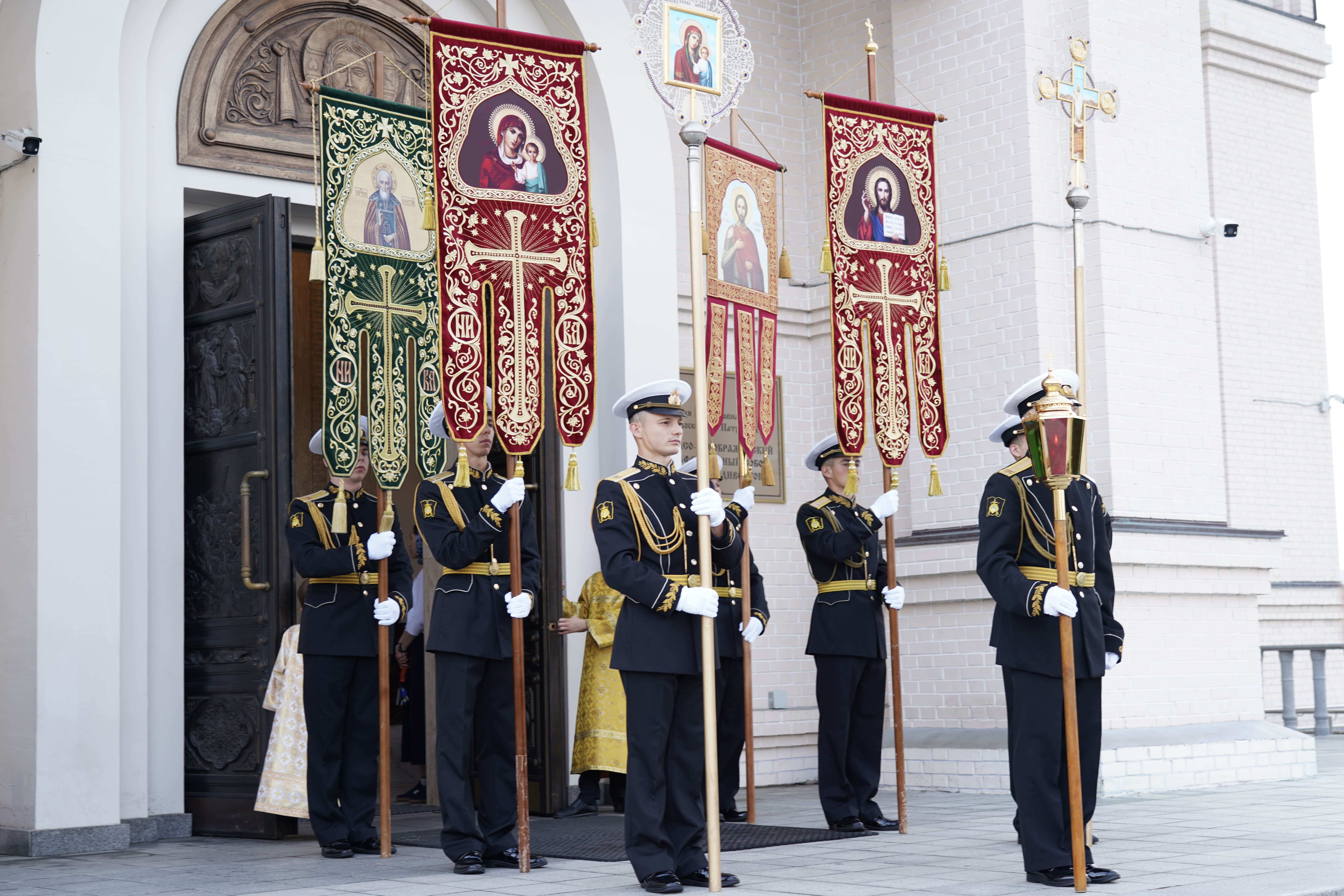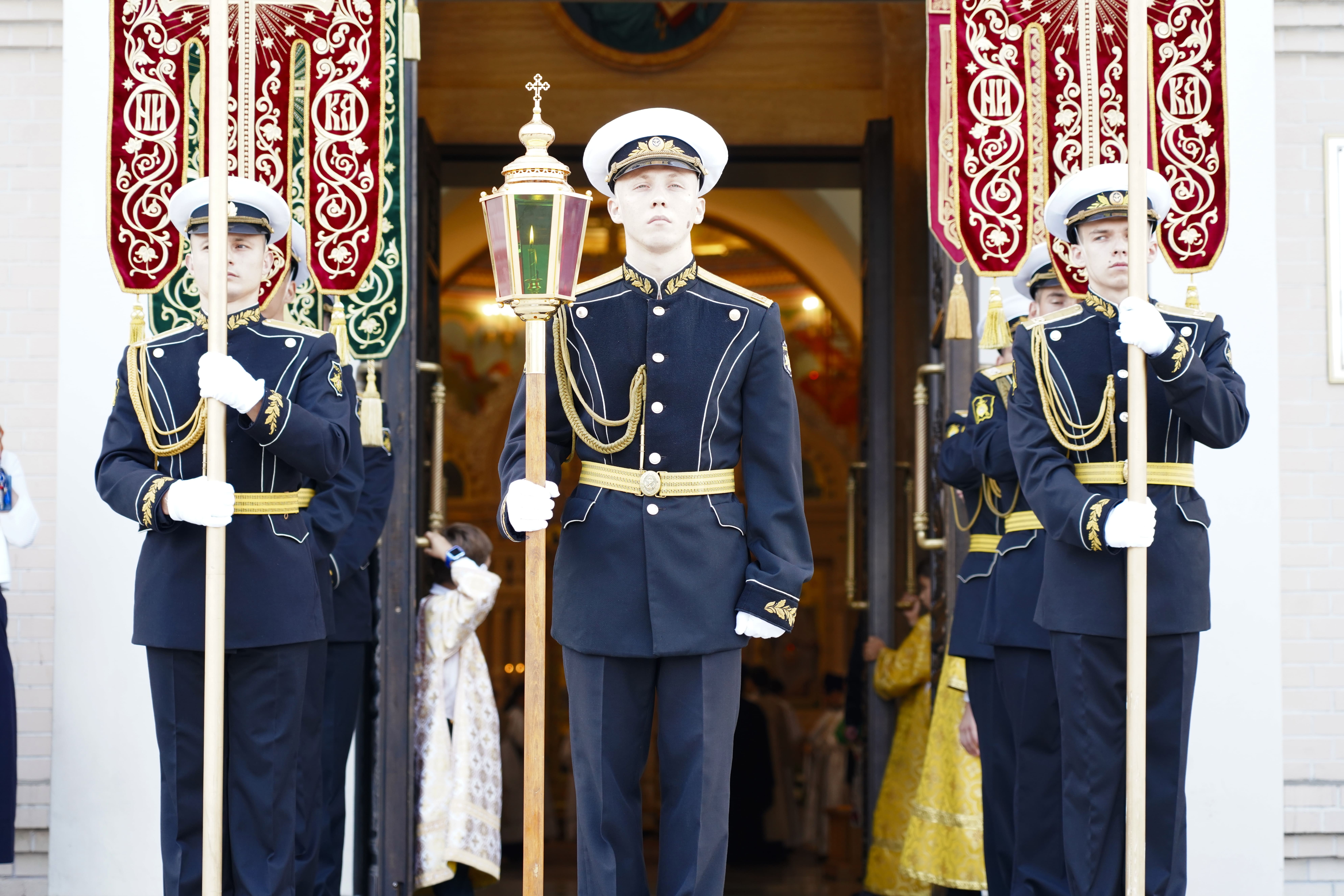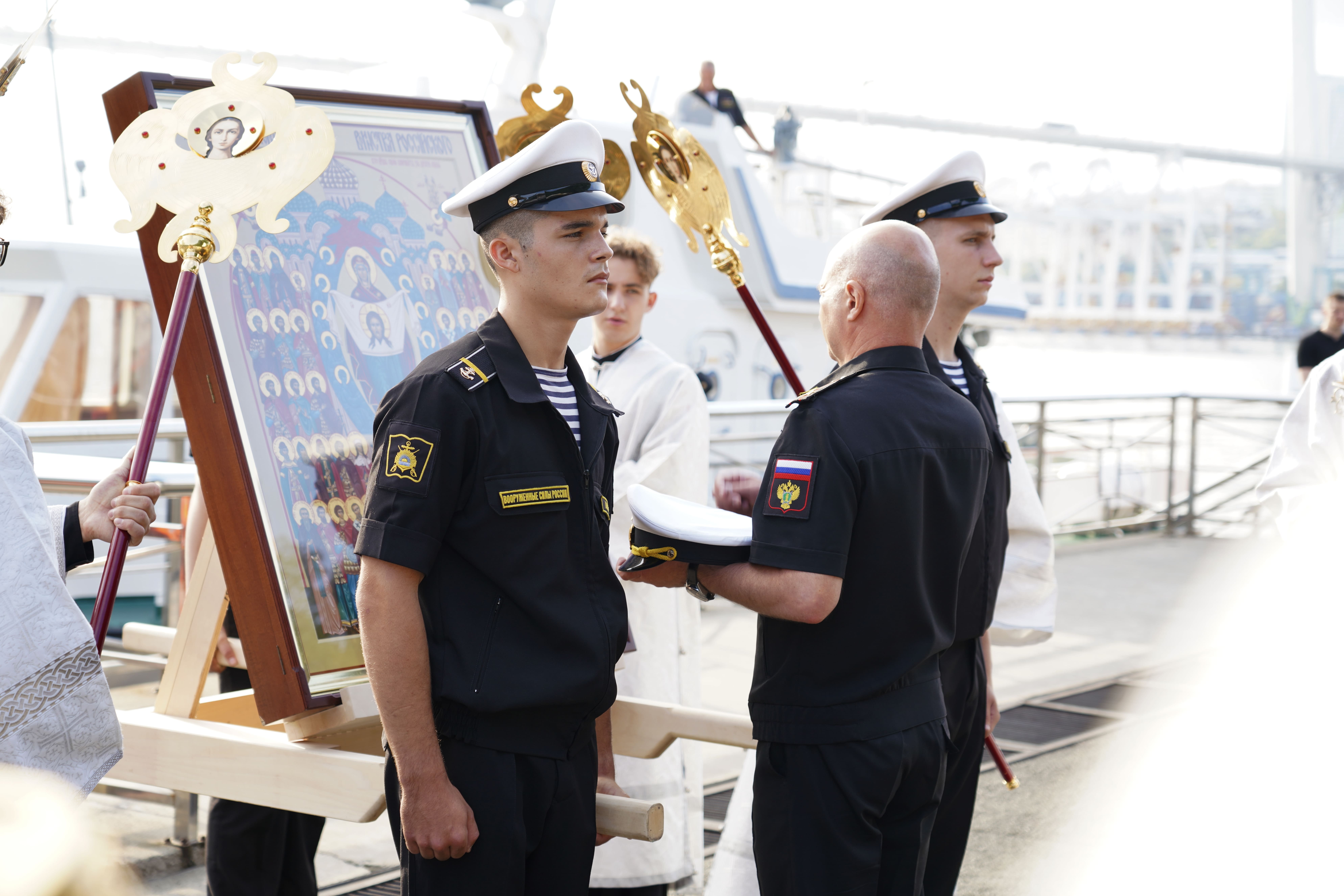На причале торжественно встретили икону, которая прибыла на катере из Храма Серафима Саровского (остров Русский). Дань традиции отдали моряки ТОФ и курсанты военно-учебного центра ВВГУ. После церемонии иконопочитания участники направились в Спасо-Преображенский кафедральный собор, где состоялась Божественная литургия и молебен о русском воинстве.