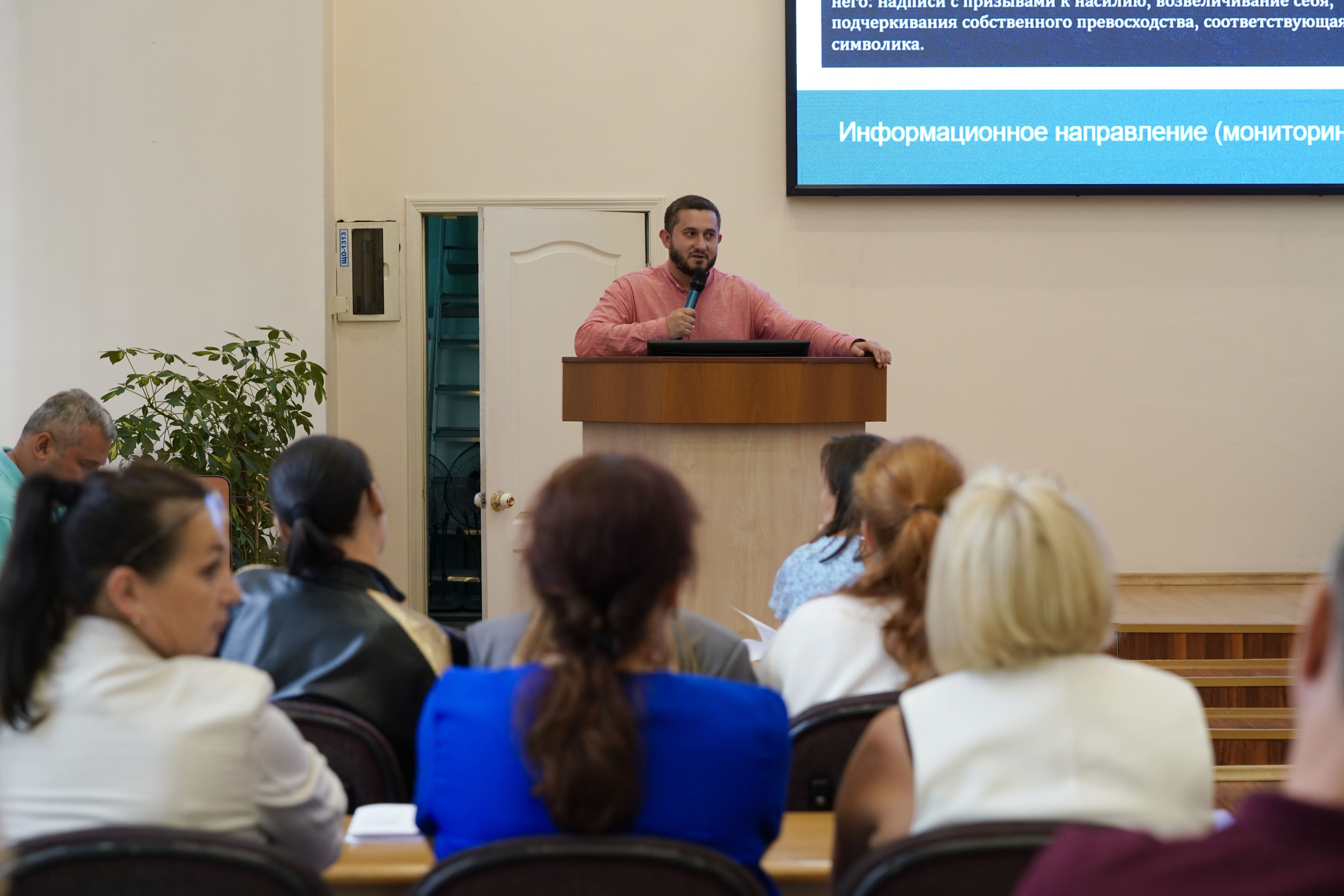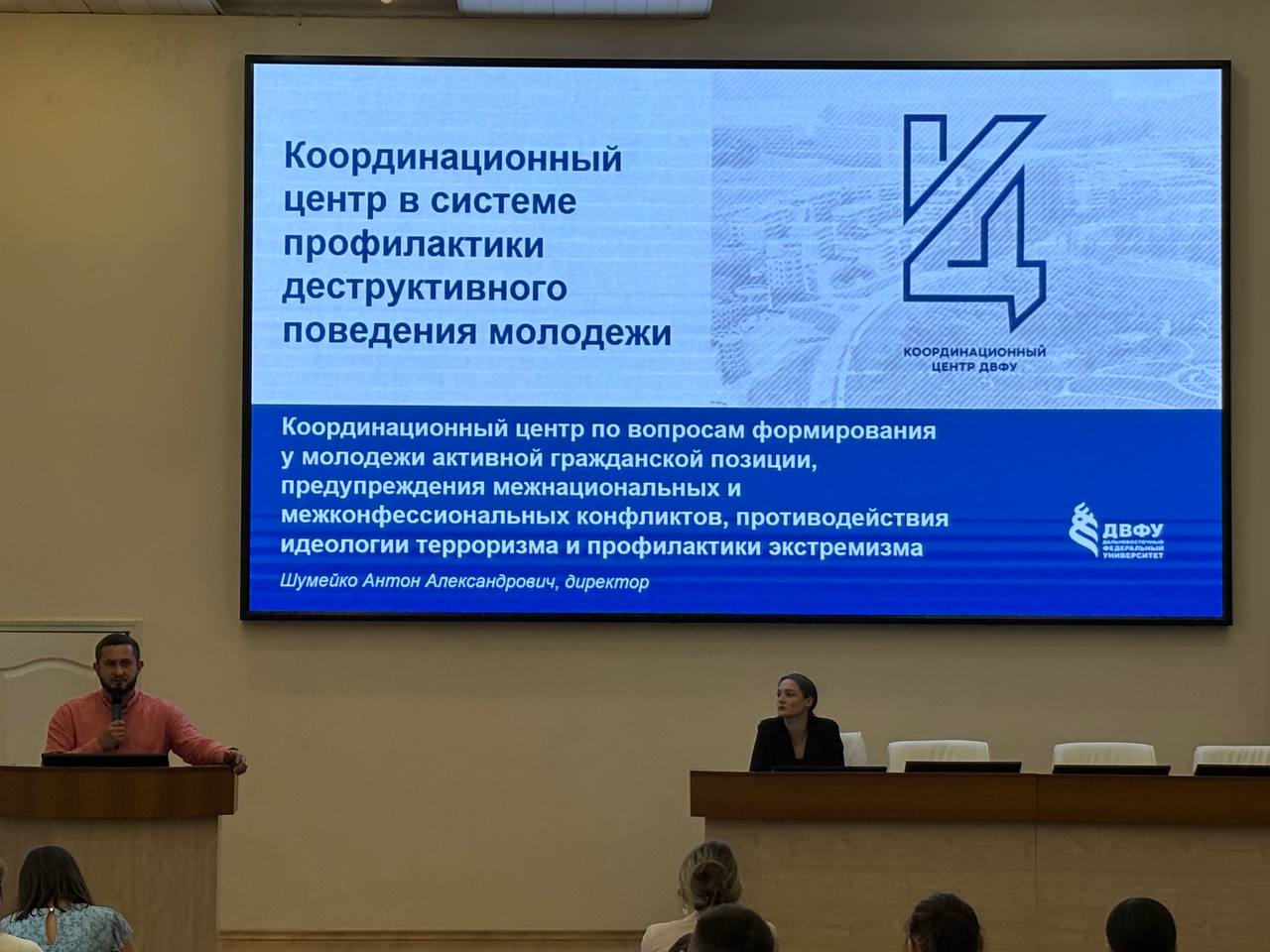 Продолжил тему профилактической деятельности приглашённый эксперт – Антон Шумейко, руководитель Приморского координационного центра по вопросам формирования у молодёжи активной гражданской позиции, предупреждения межнациональных и межконфессиональных конфликтов, противодействия идеологии терроризма и профилактики экстремизма. Спикер поделился с участниками лучшими практиками профилактической работы. Одна из них – студенческий форум-театр, который впервые прошёл в ВВГУ весной 2025 года.
