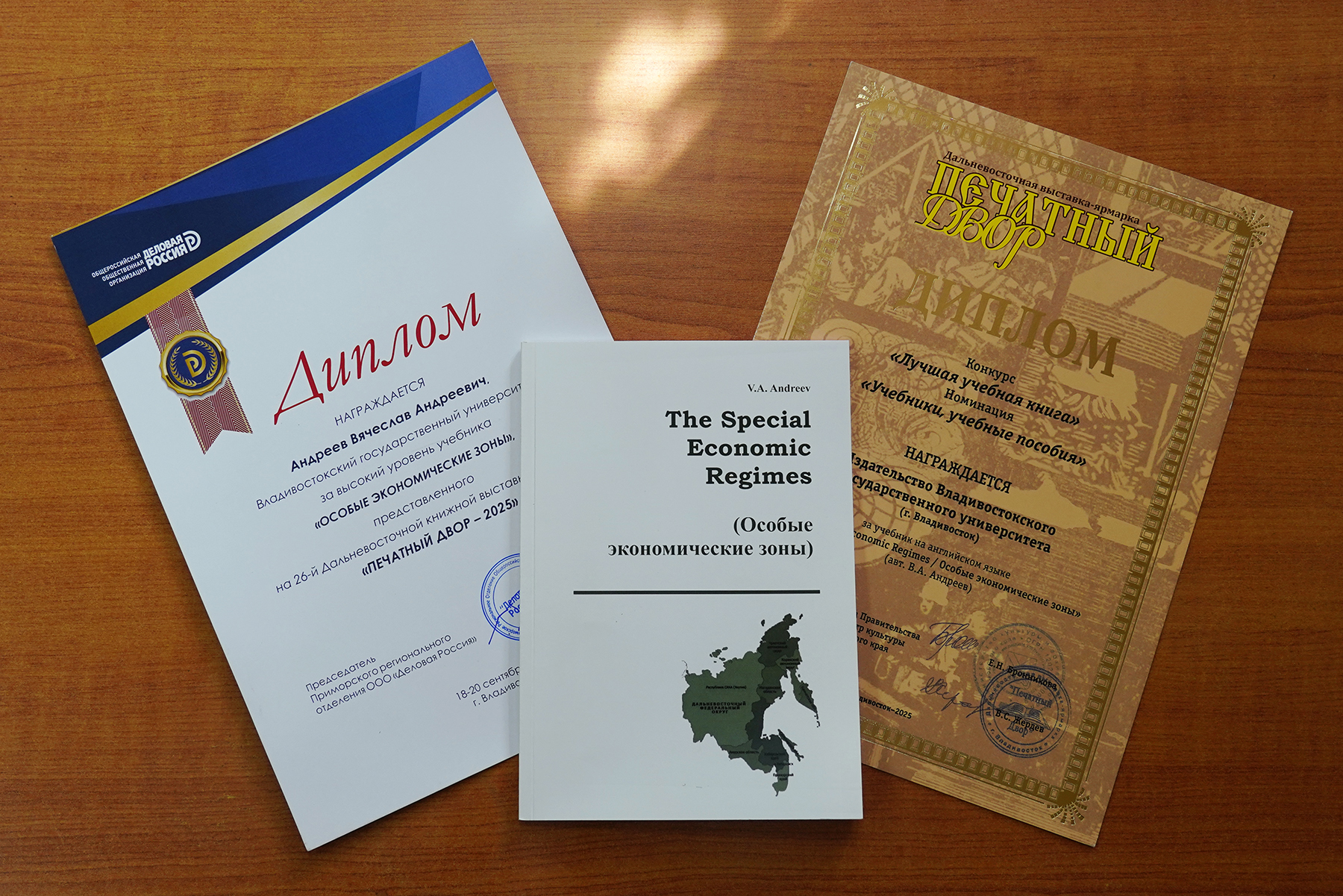 Учебник «Особые экономические зоны» на английском языке (автор В.А. Андреев) получил также и диплом Дальневосточной выставки «Печатный Двор».