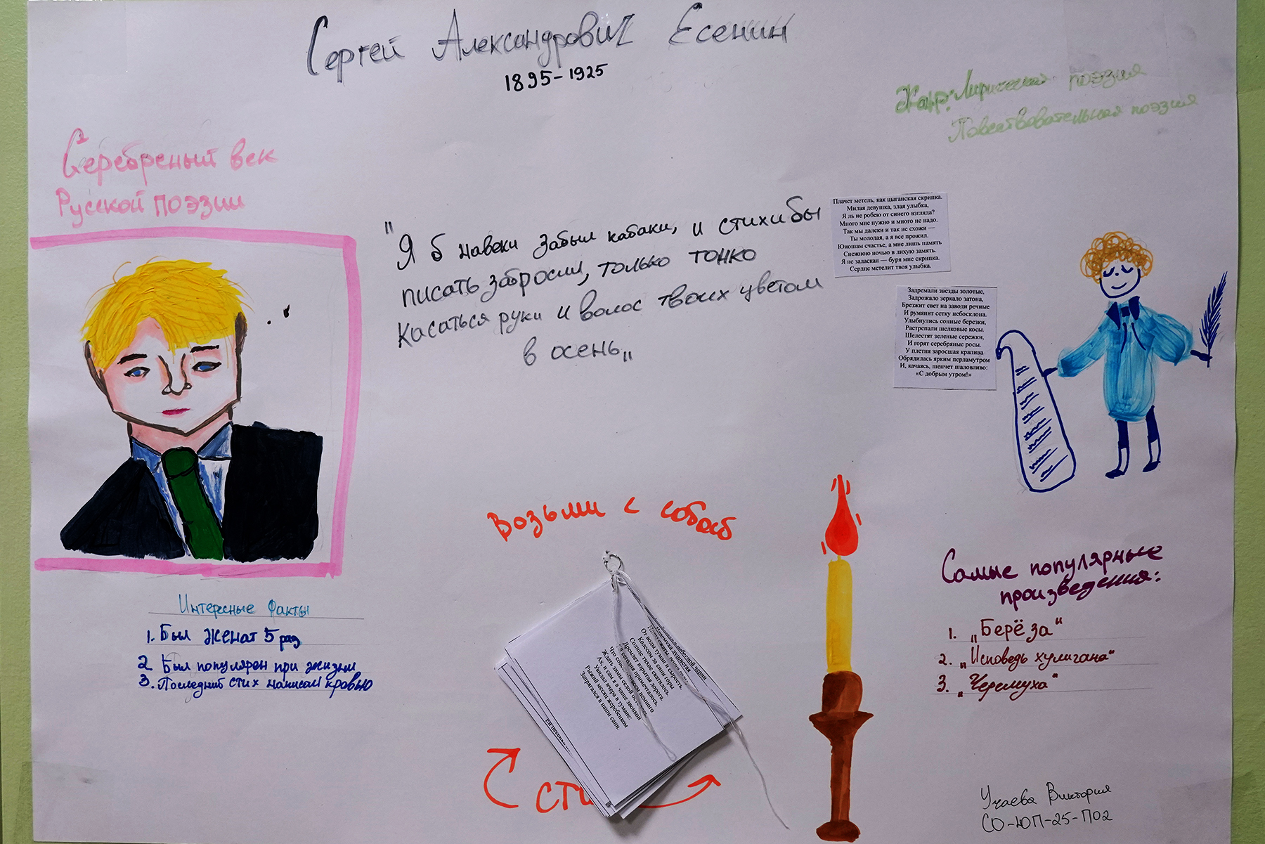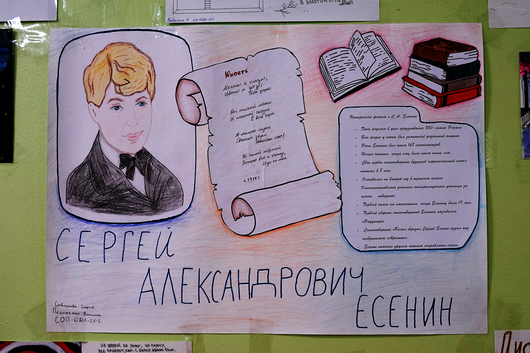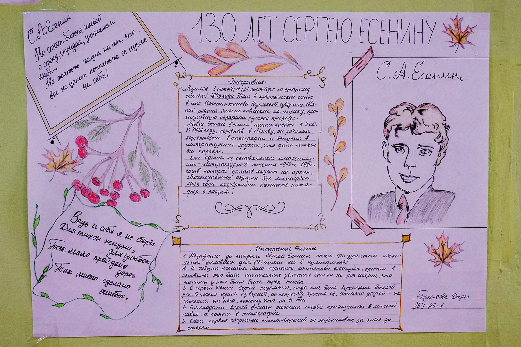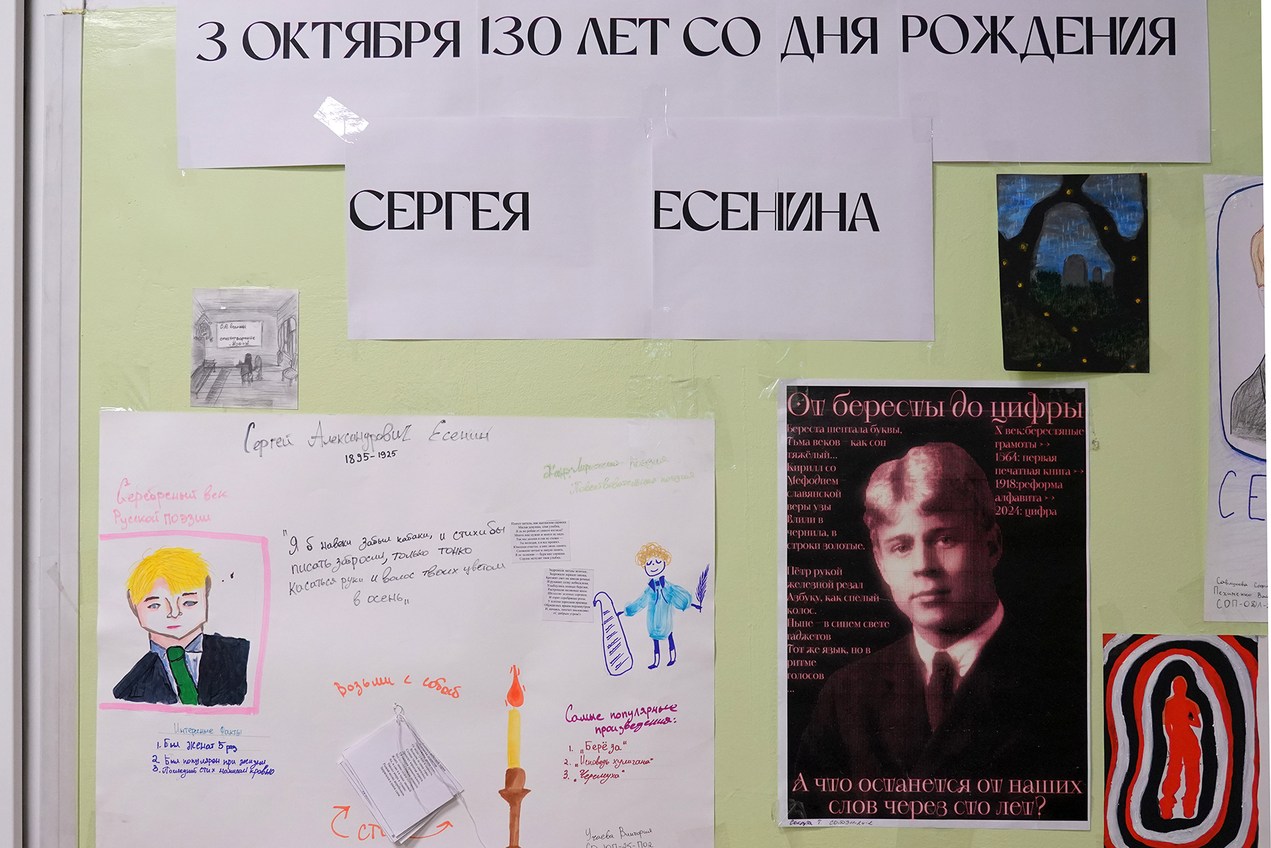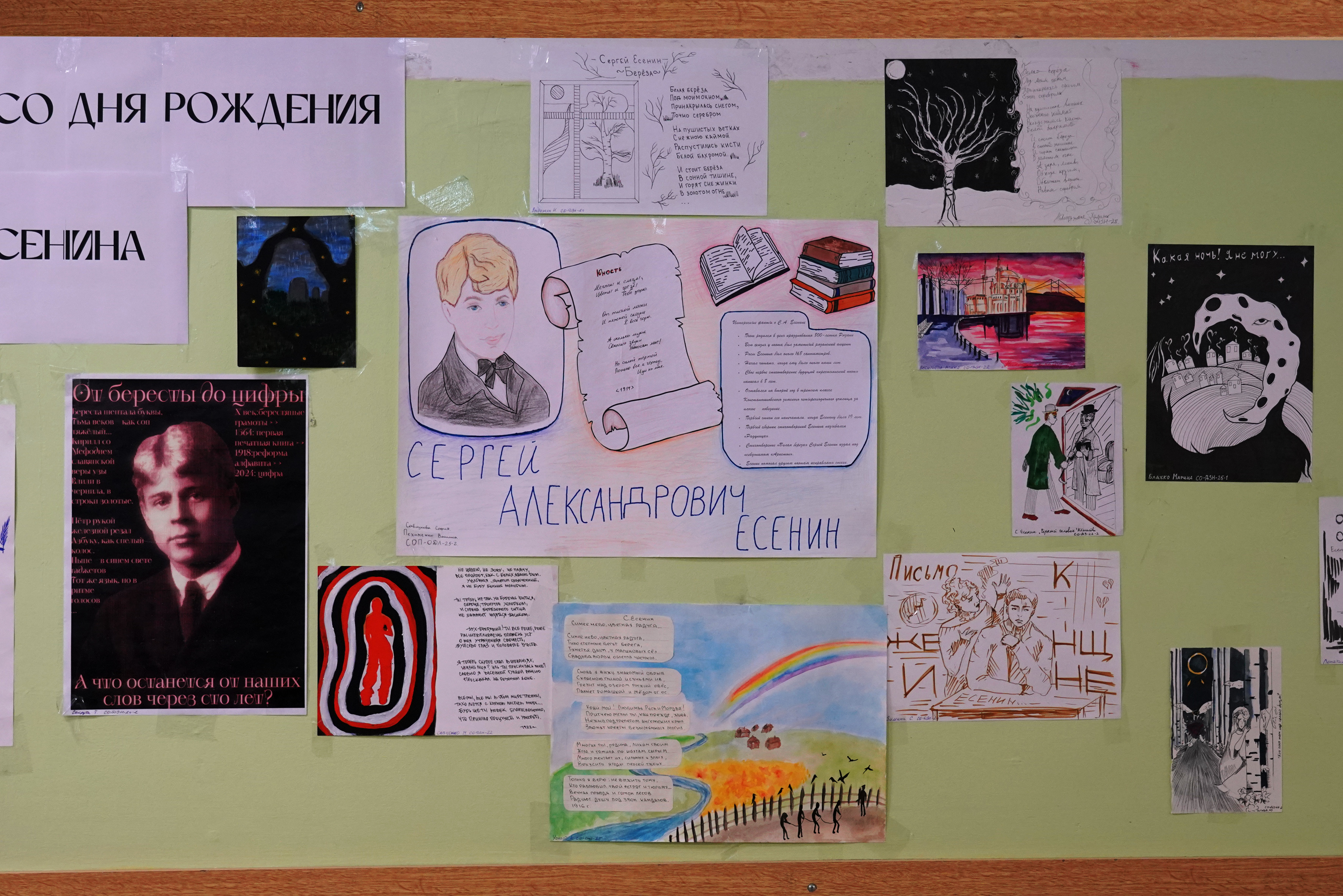 В Академическом колледже ВВГУ открыта выставка студенческих работ к юбилею одного из самых популярных мировых поэтов – Сергея Есенина. Все желающие могут познакомиться с биографией автора, интересными фактами из его жизни и лучшими работами.