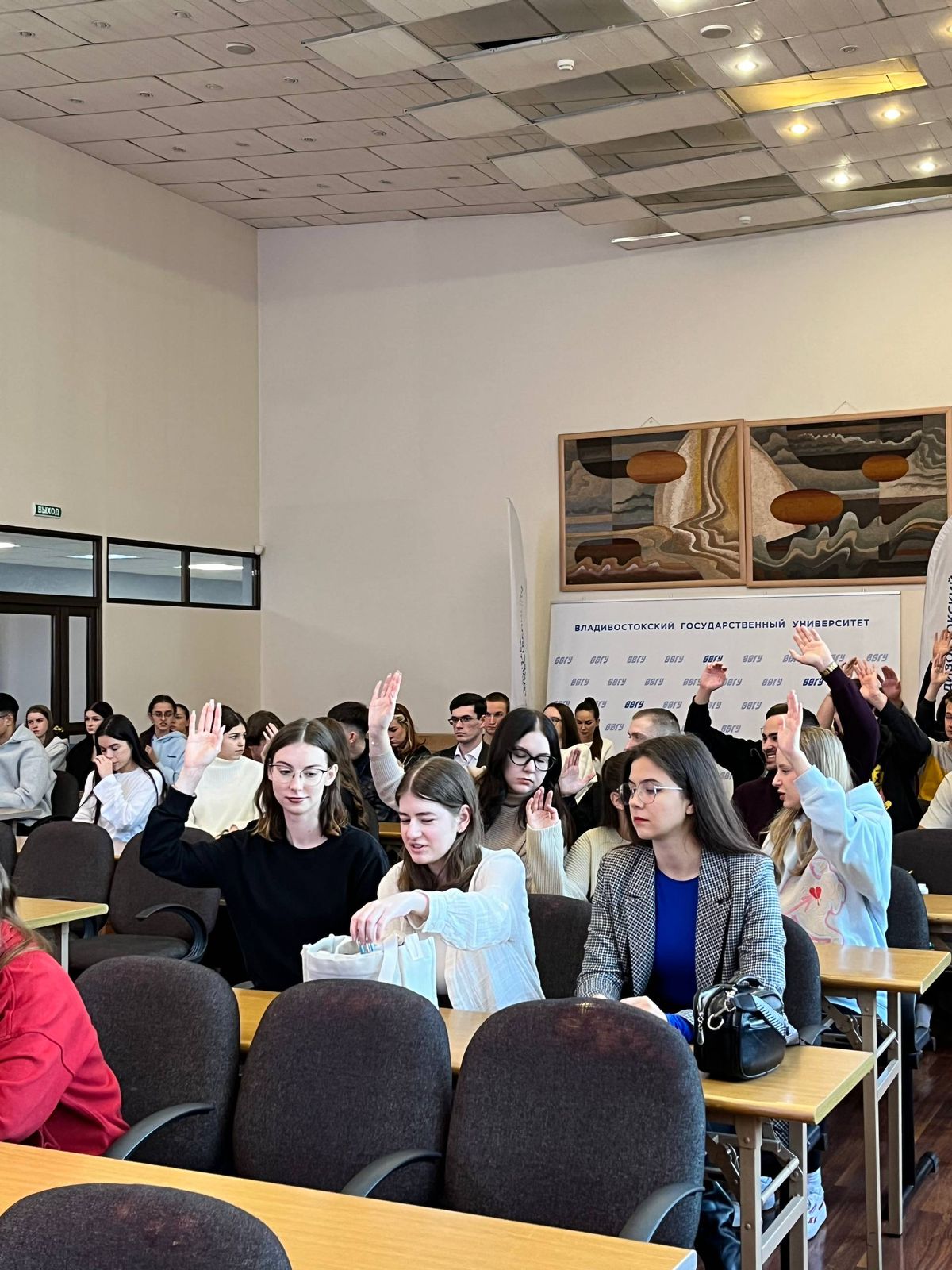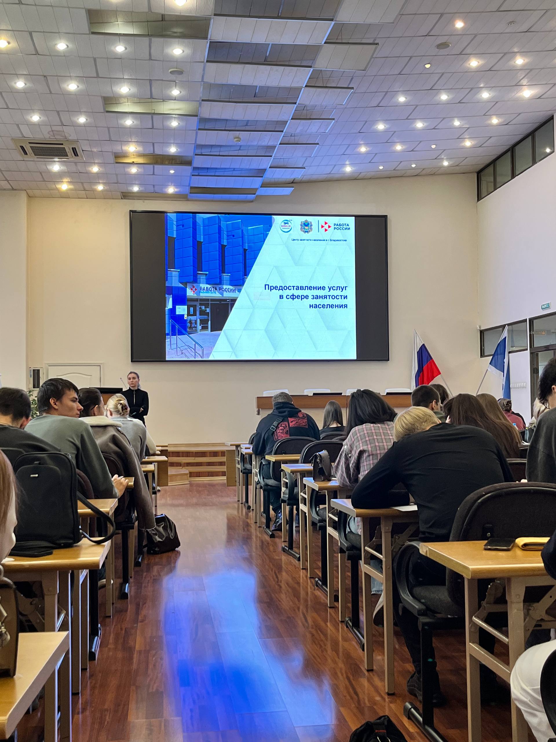 Во Владивостокском государственном университете прошла встреча студентов выпускных курсов с Приморским центром занятости населения. Молодых специалистов знакомили с карьерными перспективами и вариантами трудоустройства в дальневосточной столице. Мероприятие прошло при сотрудничестве Регионального центра «Старт-карьера» ВВГУ.