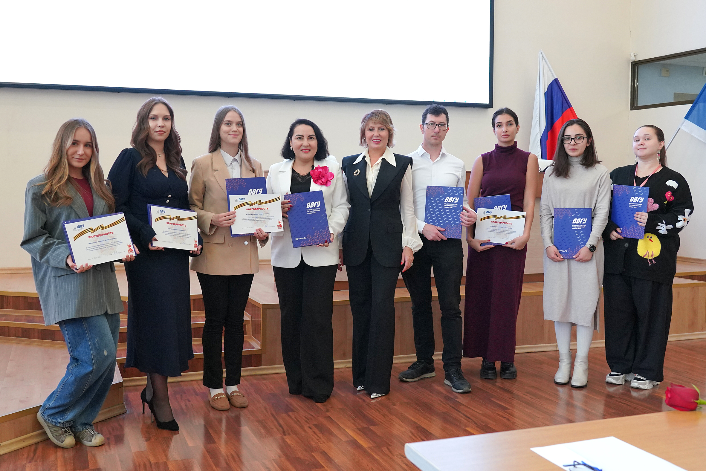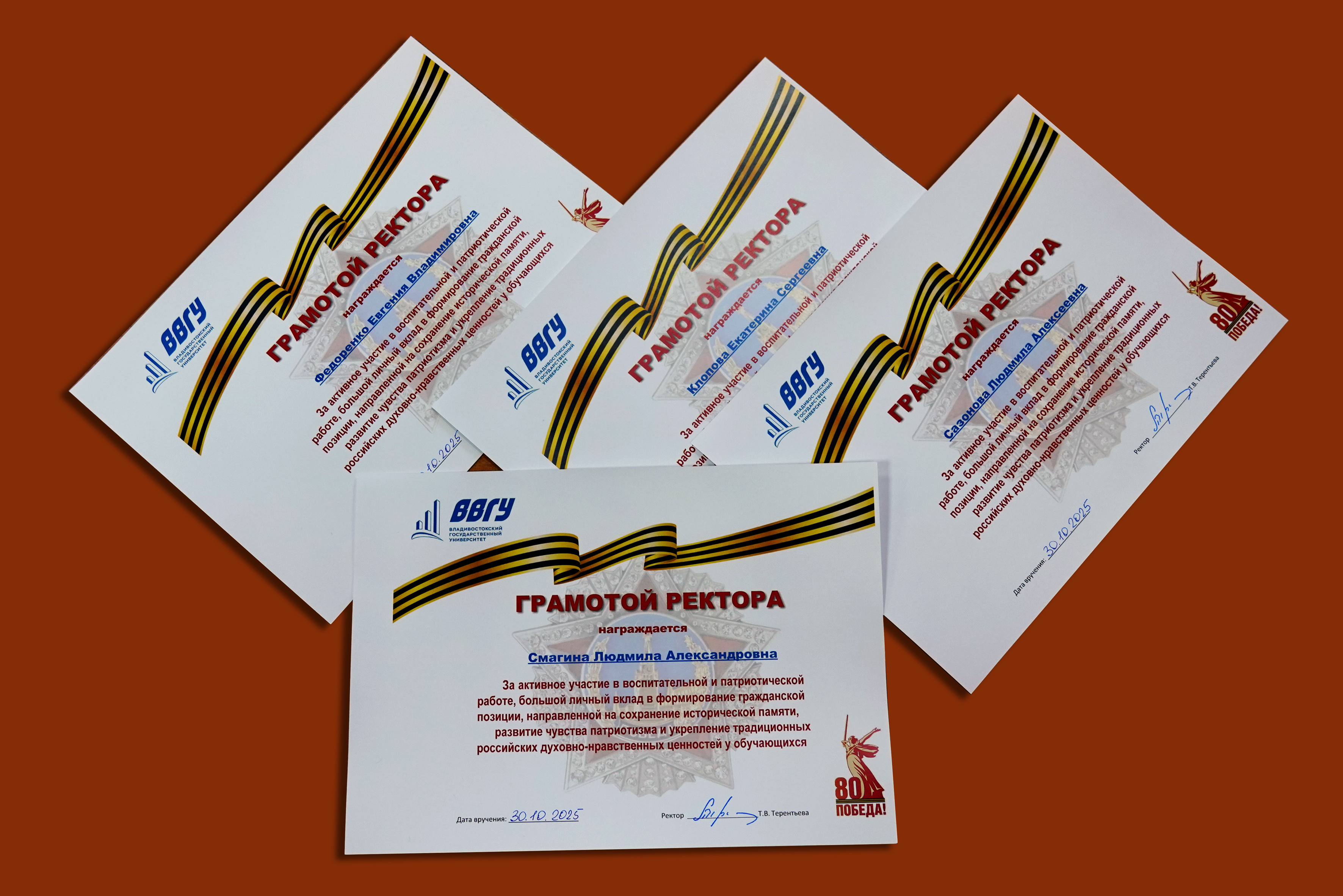 В год 80-летия Великой Победы и Год защитника Отечества благодарностями ректора за вклад в патриотическое воспитание молодёжи отметили преподавателей, педагогов и ассистентов: Светлану Безрученко, Полину Вайтушко, Павла Докучаева, Алексея Илларионова, Ульяну Кислюкову, Ирину Кравченко, Анну Пашкову, Екатерину Полицыну, Ирину Хорольскую, Анастасию Шпет, Ольгу Иванову, Наталью Ларкину, Альбину Макаренко, Яну Волынчук, Анну Вертинову, Дмитрия Акинфеева, Нину Шереметьеву, Марину Арнаут, Олега Городникова, Екатерину Султанову, Оксану Налетку, Анну Свиридову, Елену Пугачёву, Алину Муратову.