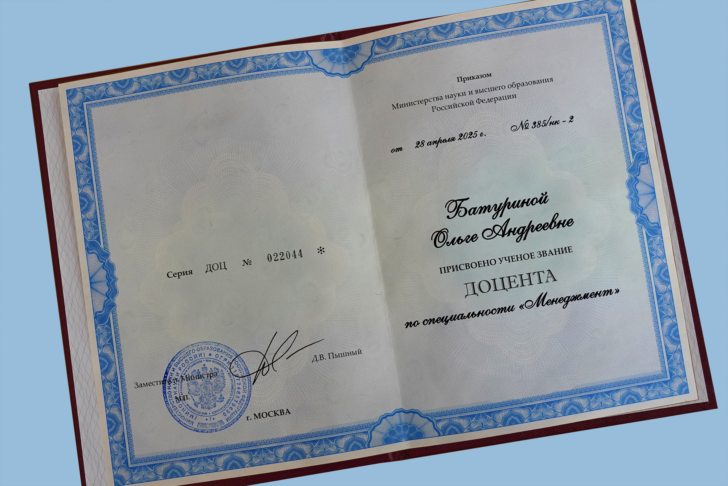 Проректора по академической политике Ольгу Батурину – поздравили с присвоением звания доцента по специальности «Менеджмент»;