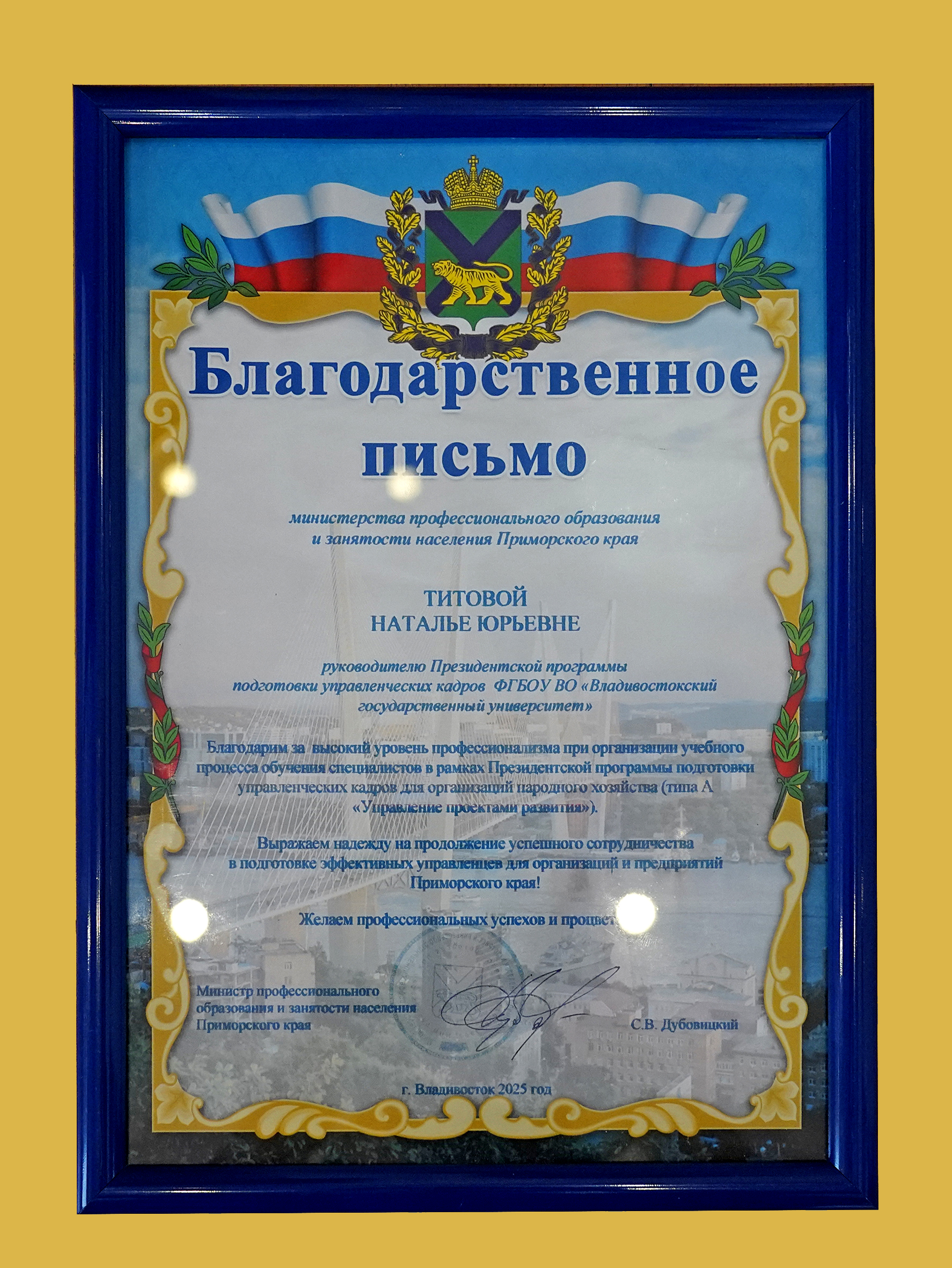 Доцента кафедры экономики и управления, руководителя Президентской программы подготовки управленческих кадров ВВГУ Наталью Титову – благодарственное письмо Министерства профессионального образования и занятости населения Приморского края.