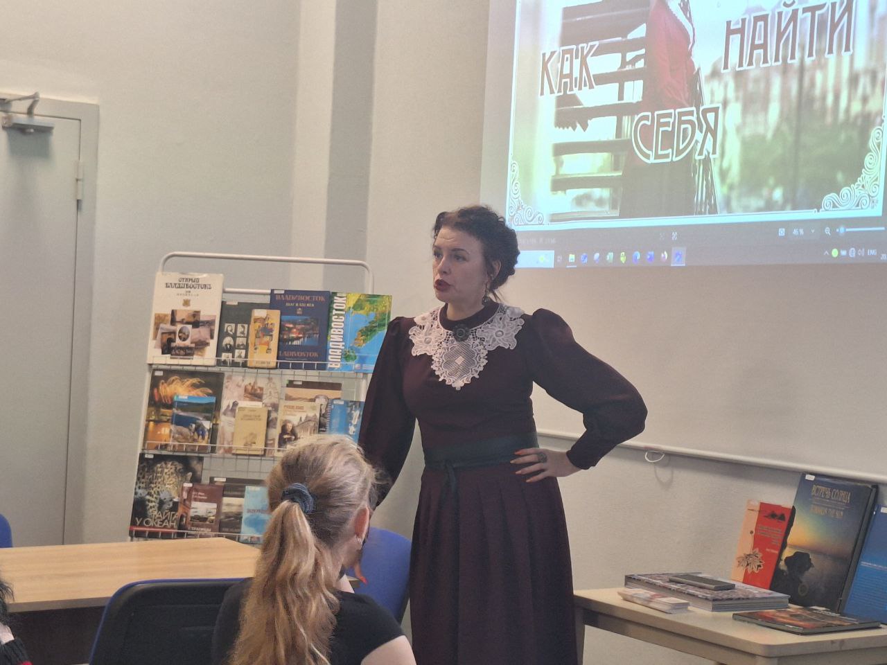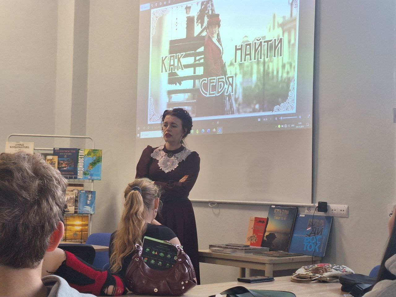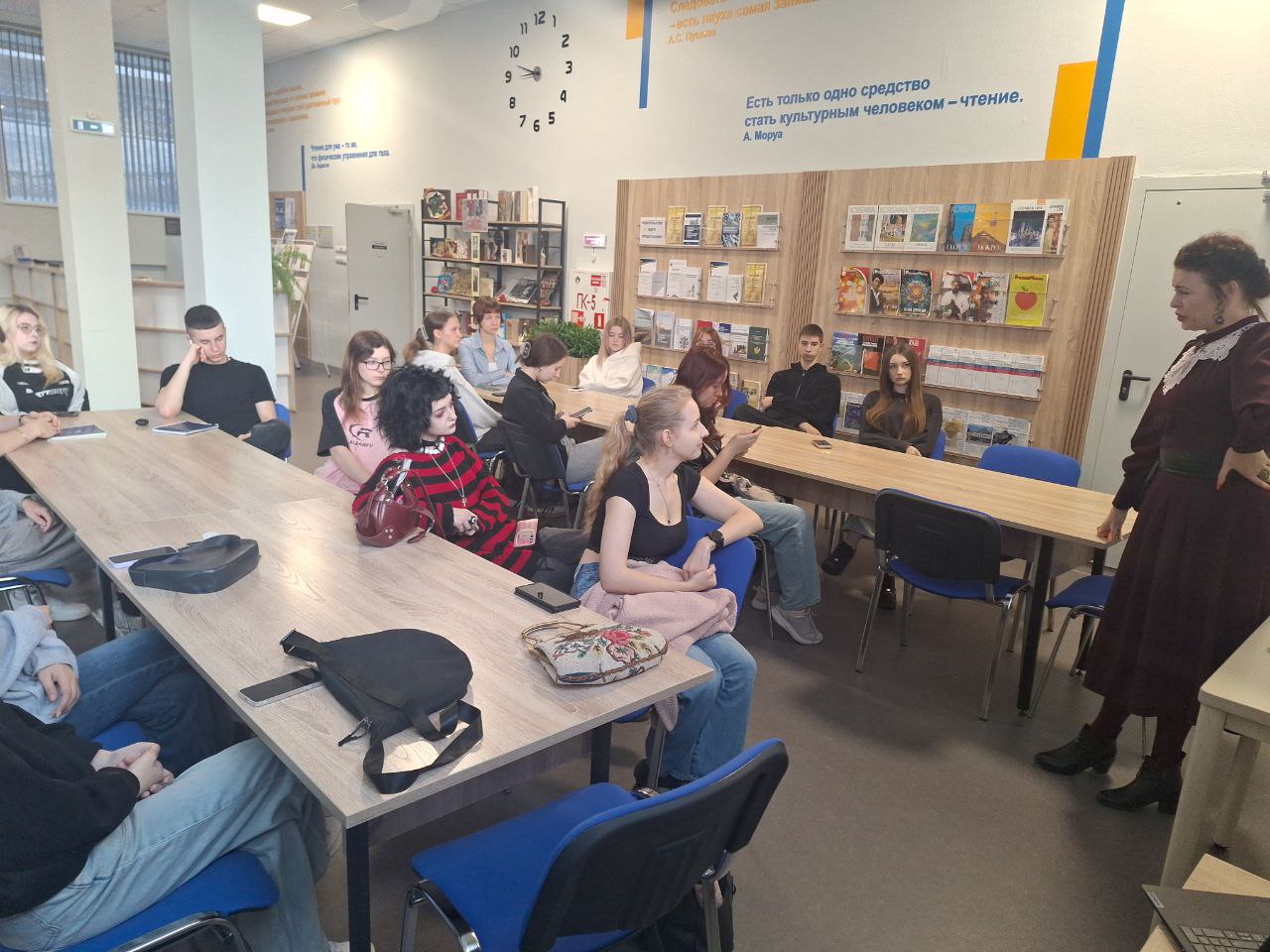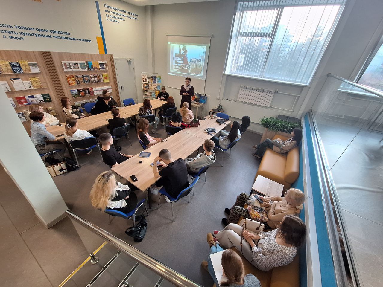 20 ноября по инициативе библиотекаря и преподавателя Колледжа информационных и креативных технологий Веры Вячеславовны Кавецкой в библиотеке состоялась творческая встреча студентов Колледжа информационных и креативных технологий, осваивающих профессии турагентов и туроператоров (СОп –ТГ – 24 -ТТ1 и СП –ТГ-25 –ТТ1), с экскурсоводом Татьяной Александровной Фоменко.