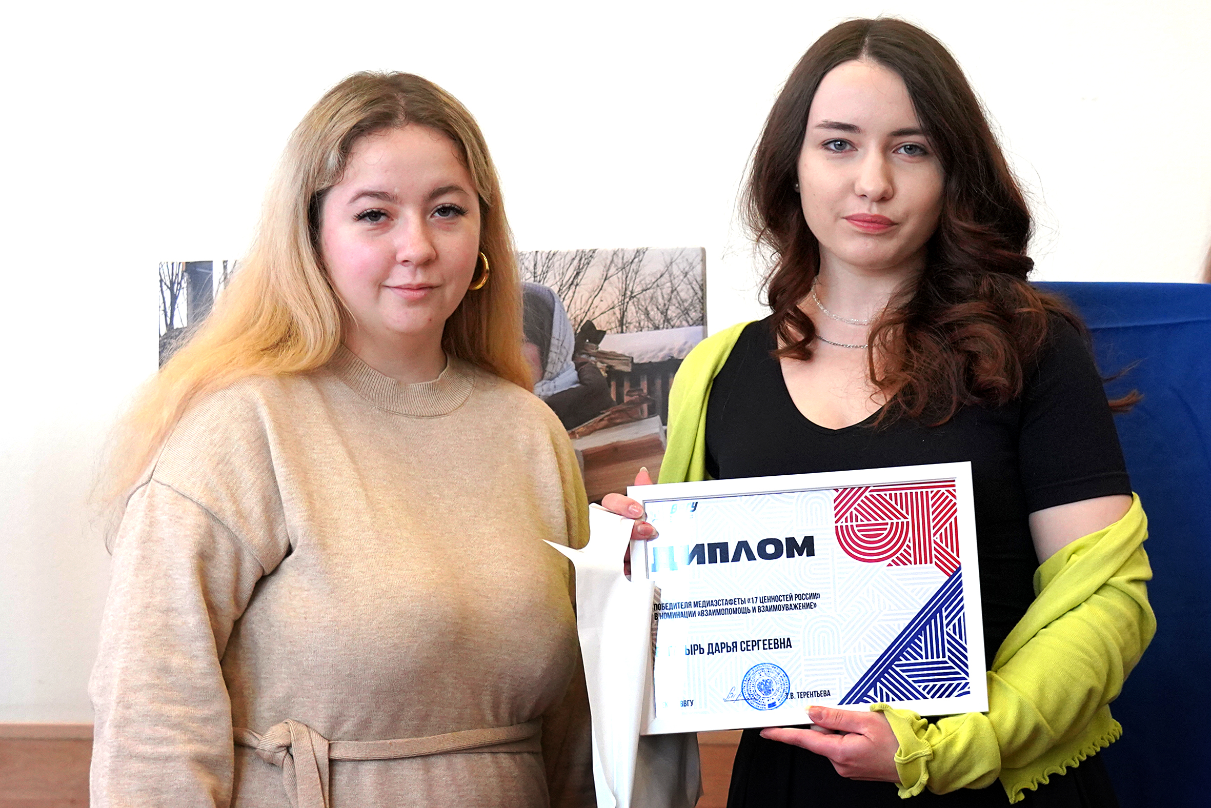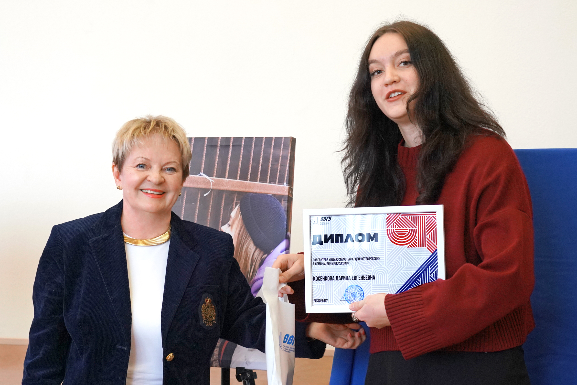 Особое внимание было уделено ценности, составляющей нравственный фундамент общества, – патриотизму. Ректор ВВГУ доктор экономических наук, профессор Татьяна Терентьева лично наградила победителя в этой номинации.