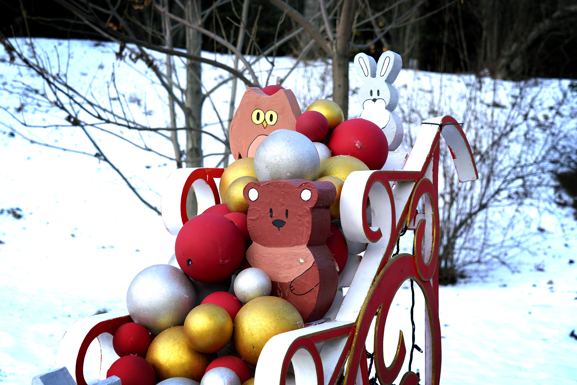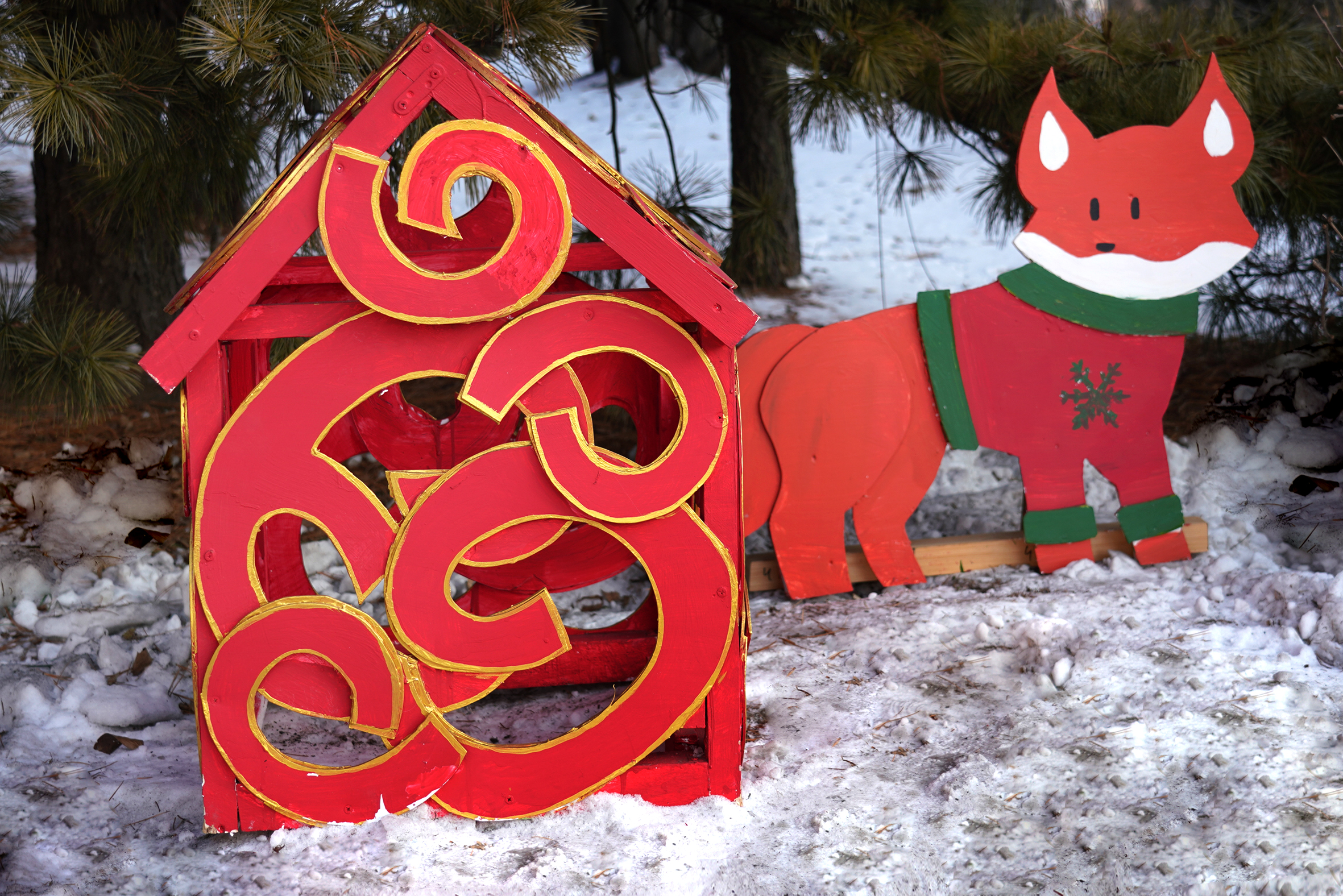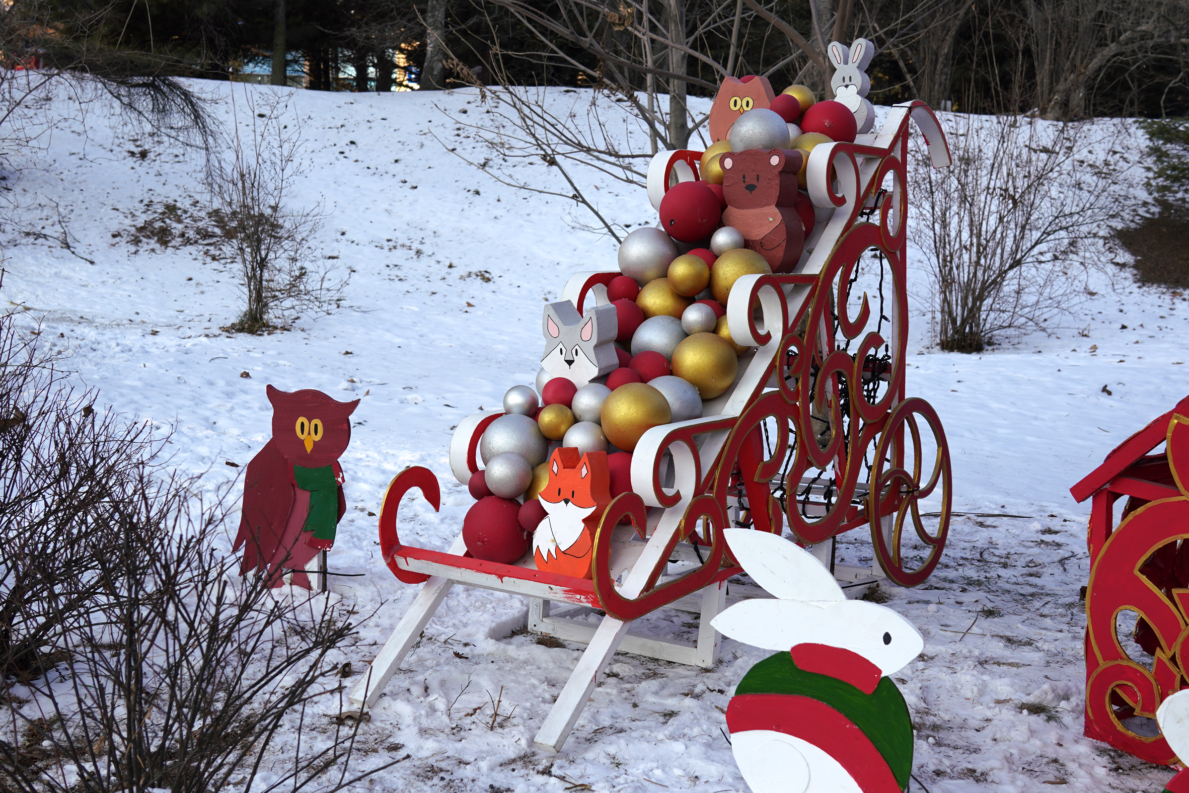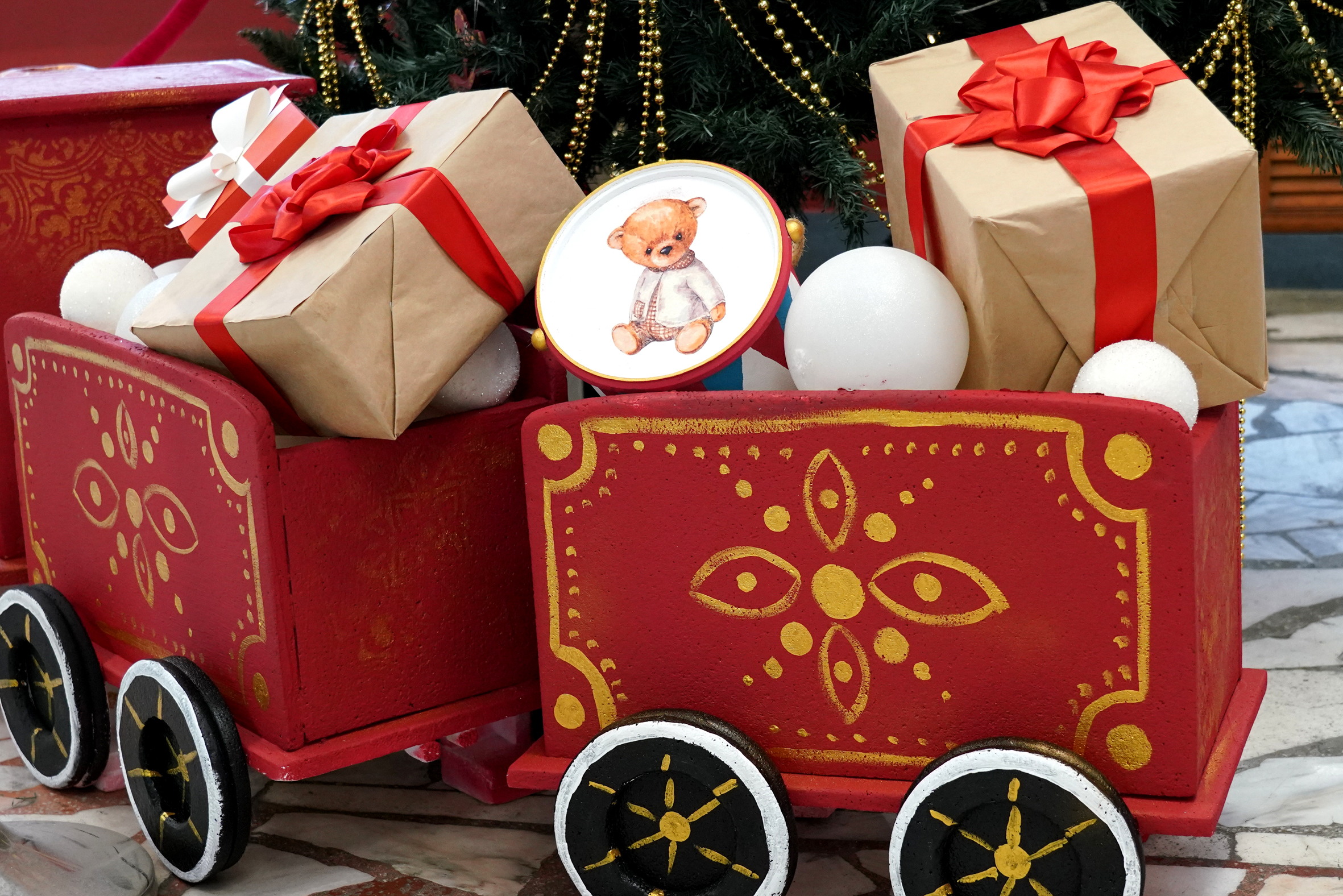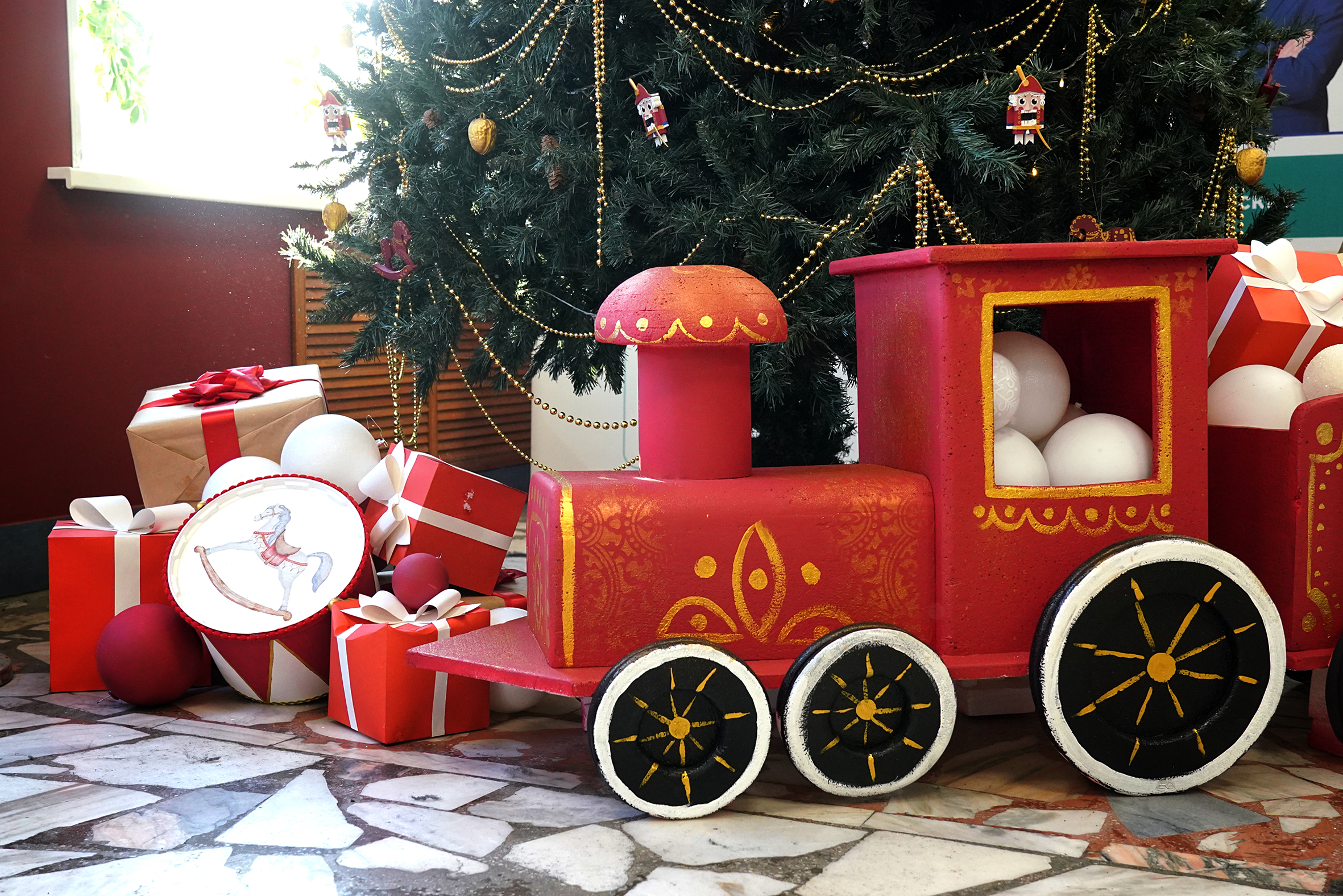 Главным звеном украшения стал новогодний поезд с подарками. Массивную инсталляцию установили у самого подножия новогодней ели. Вся она изготовлена студентами вручную из простого пенопласта.
