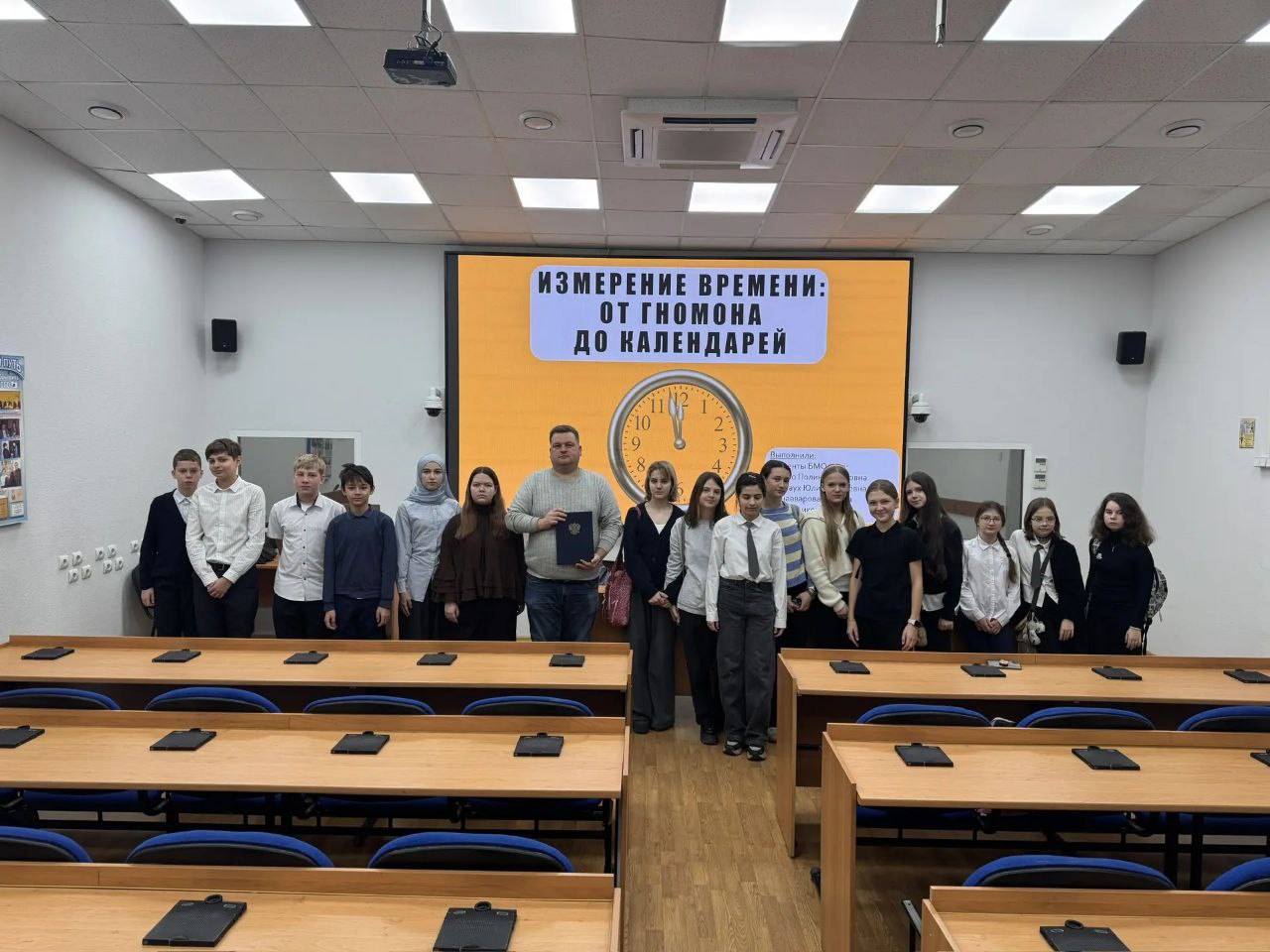 Студентки Полина Сесько и Махина Мунавварова под руководством доцента Романа Гриванова подготовили для ребят лекцию и познавательную викторину по истории появления и развития летоисчисления и календаря.