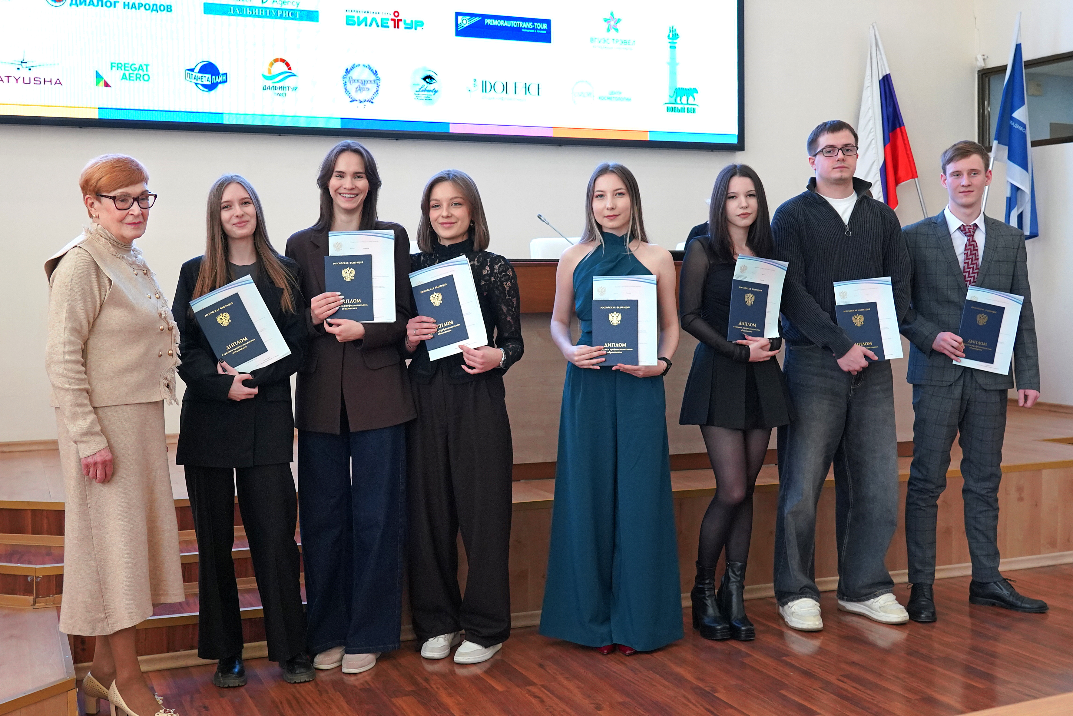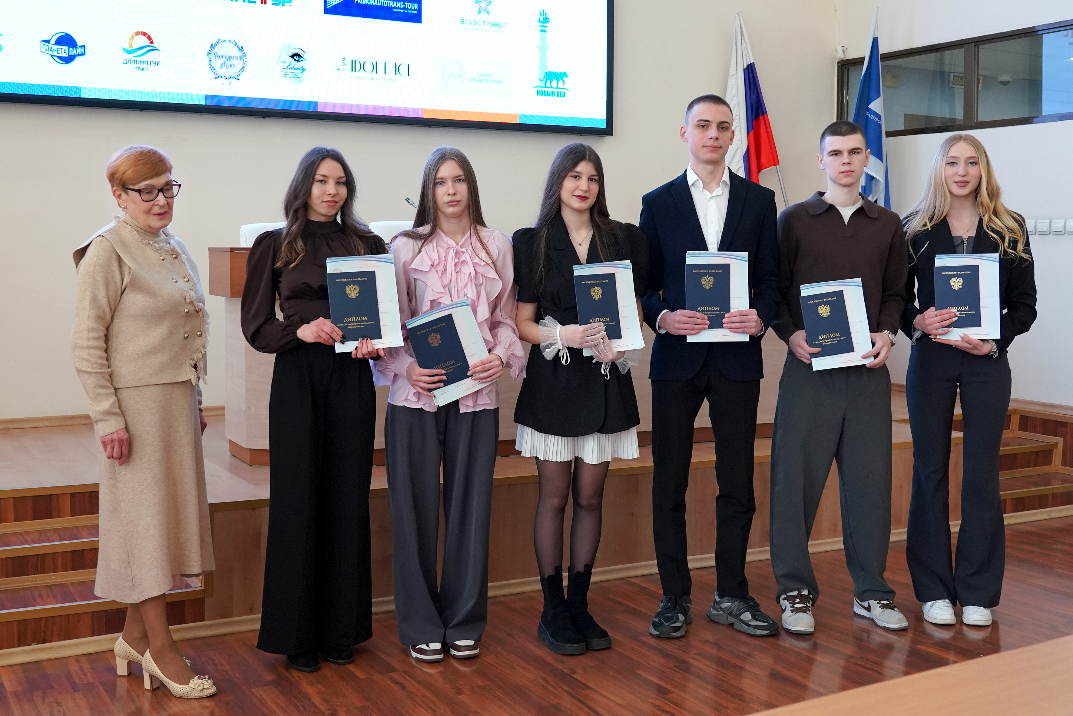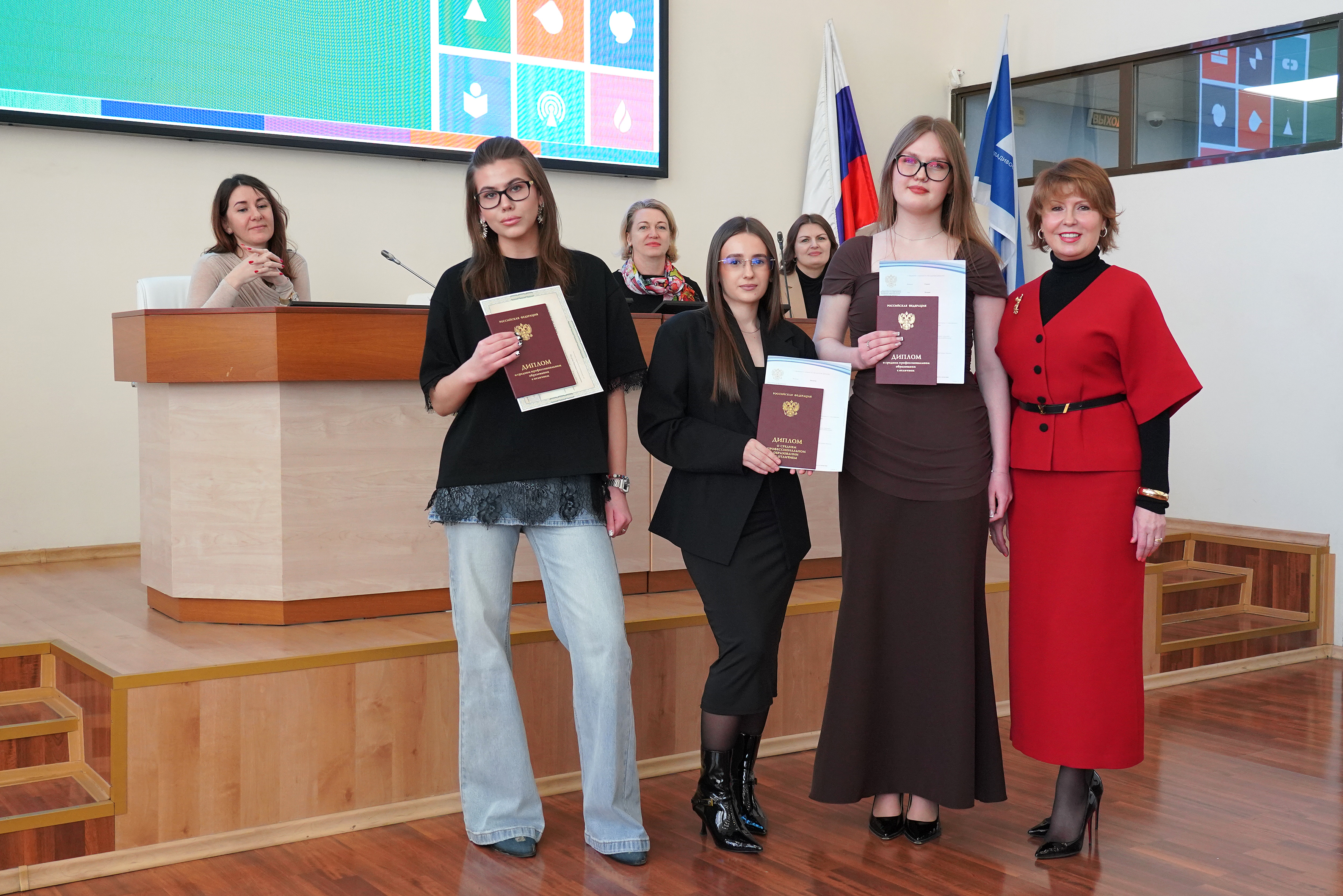 В ВВГУ прошла торжественная церемония вручения дипломов выпускникам Академического колледжа и Колледжа информационных и креативных технологий. Свой первый документ об образовании получили студенты специальностей «Операционная деятельность в логистике», «Туризм и гостеприимство» и «Технологии индустрии красоты», завершившие обучение по федеральной программе «Профессионалитет».