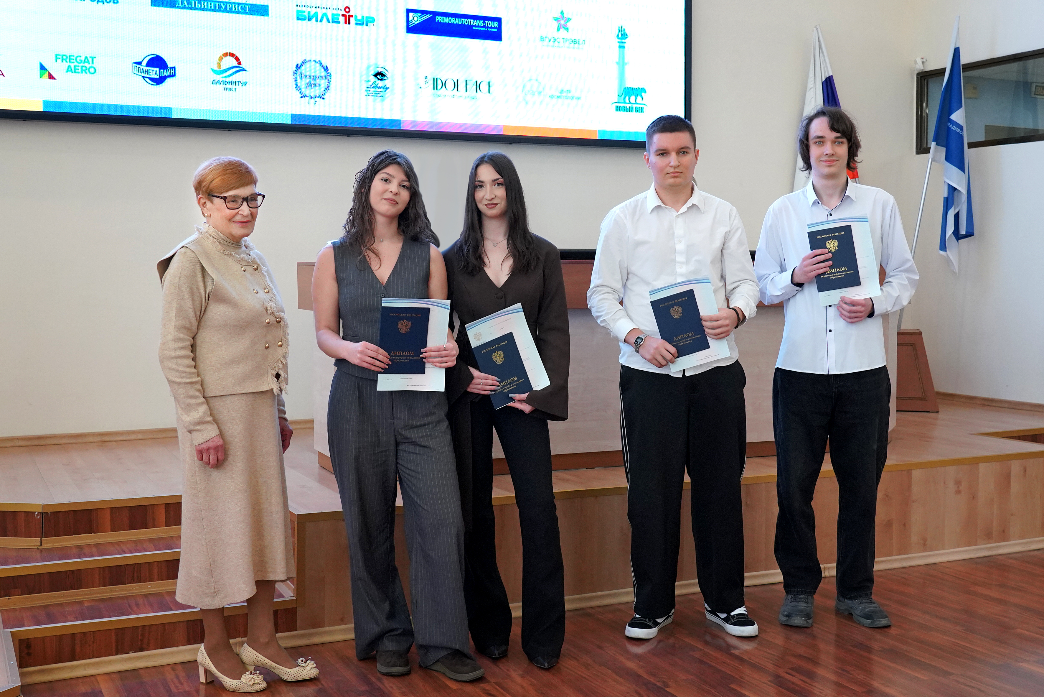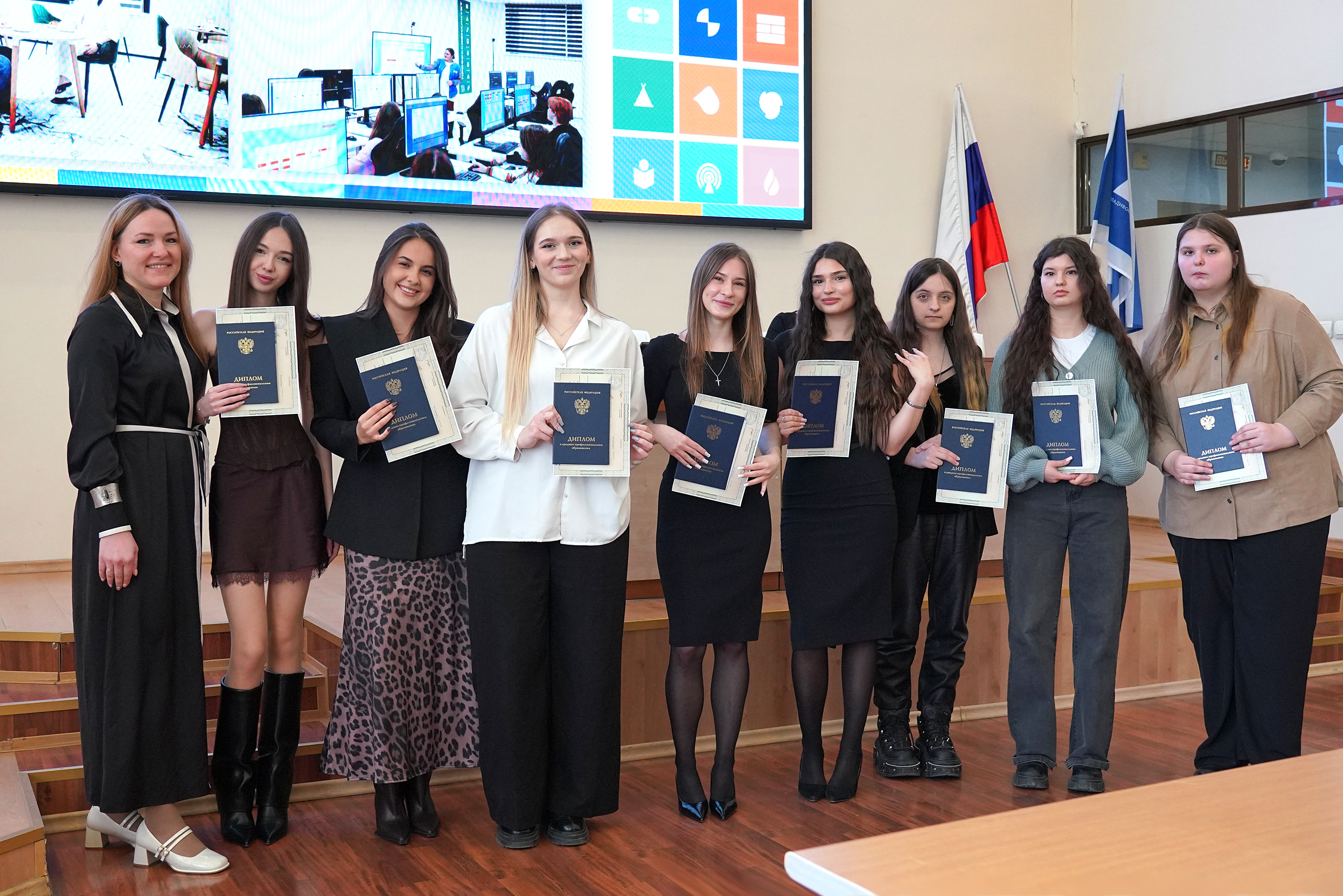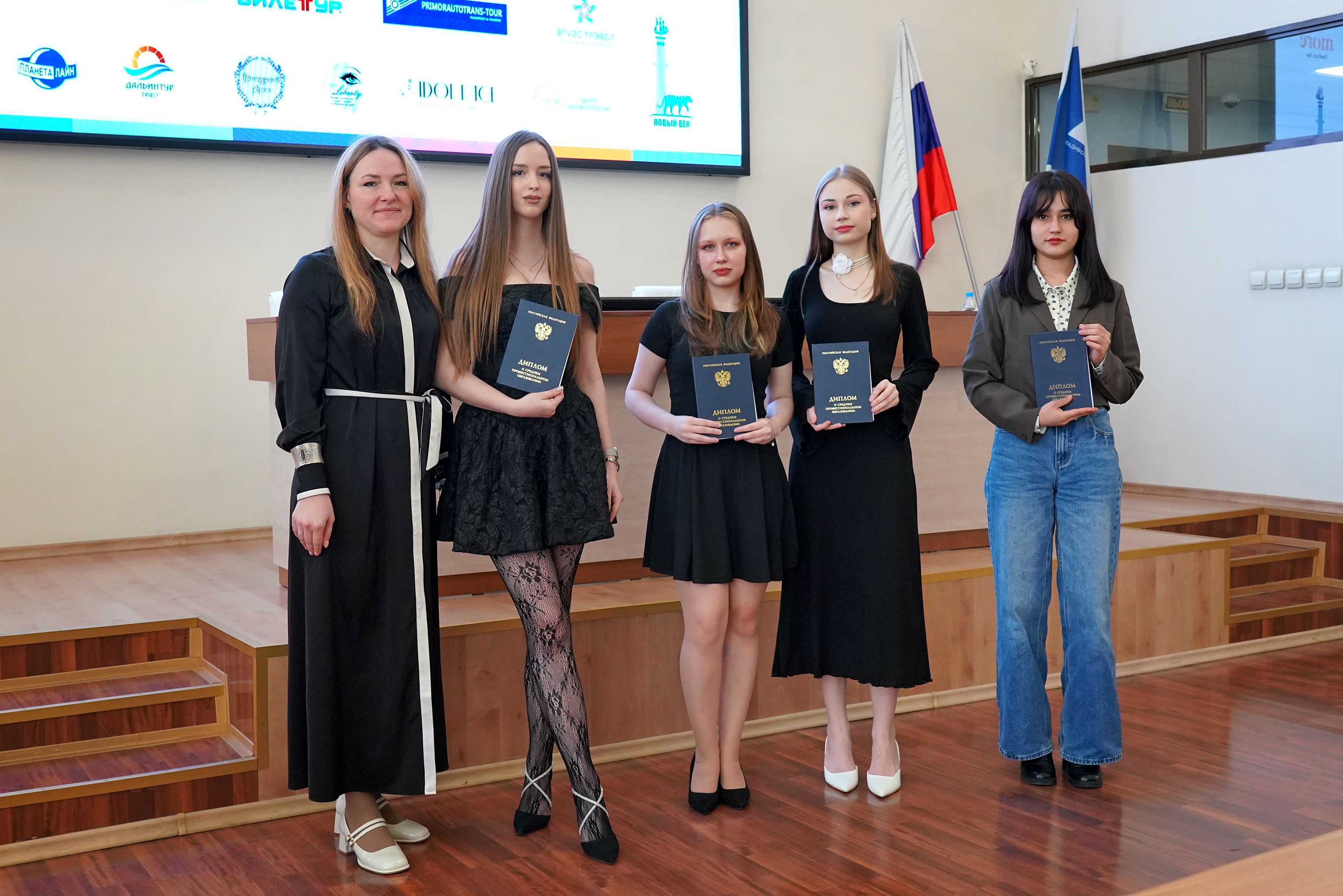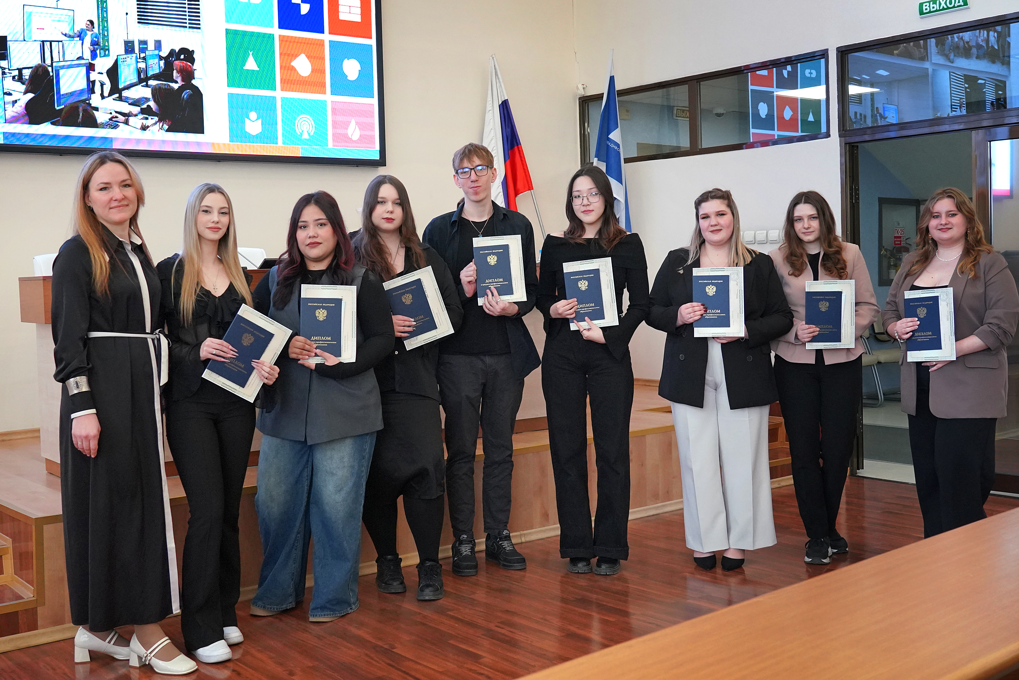 В ВВГУ прошла торжественная церемония вручения дипломов выпускникам Академического колледжа и Колледжа информационных и креативных технологий. Свой первый документ об образовании получили студенты специальностей «Операционная деятельность в логистике», «Туризм и гостеприимство» и «Технологии индустрии красоты», завершившие обучение по федеральной программе «Профессионалитет».