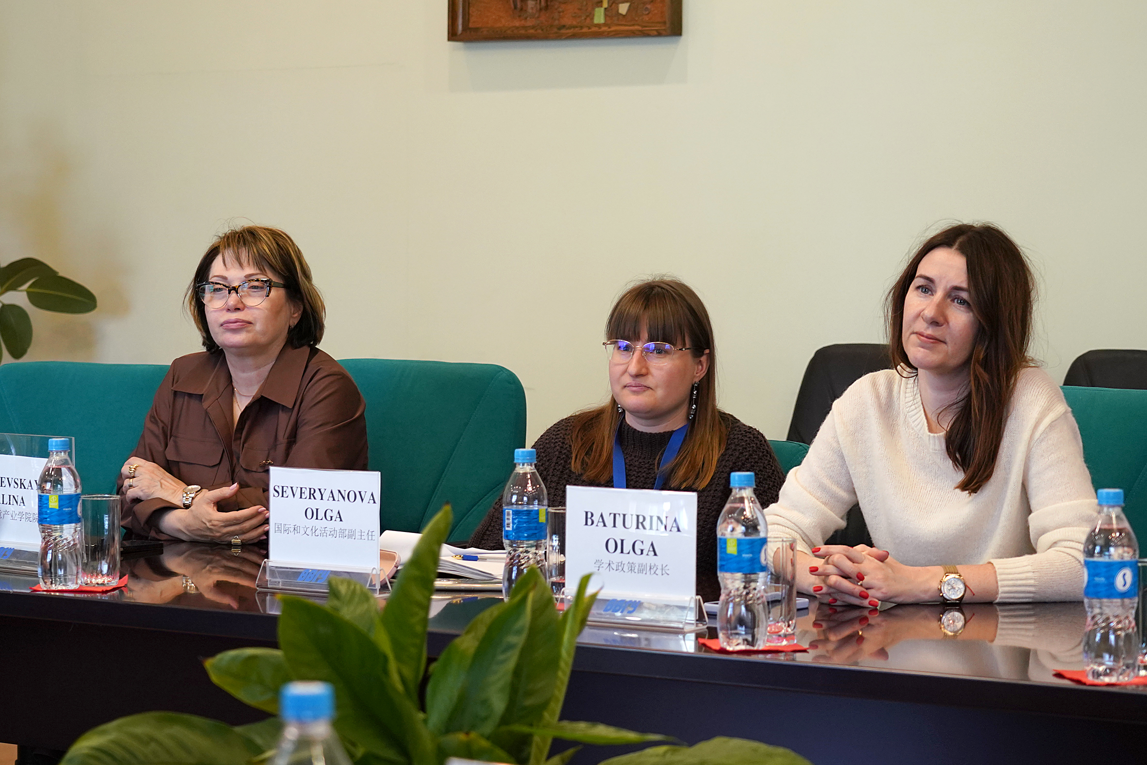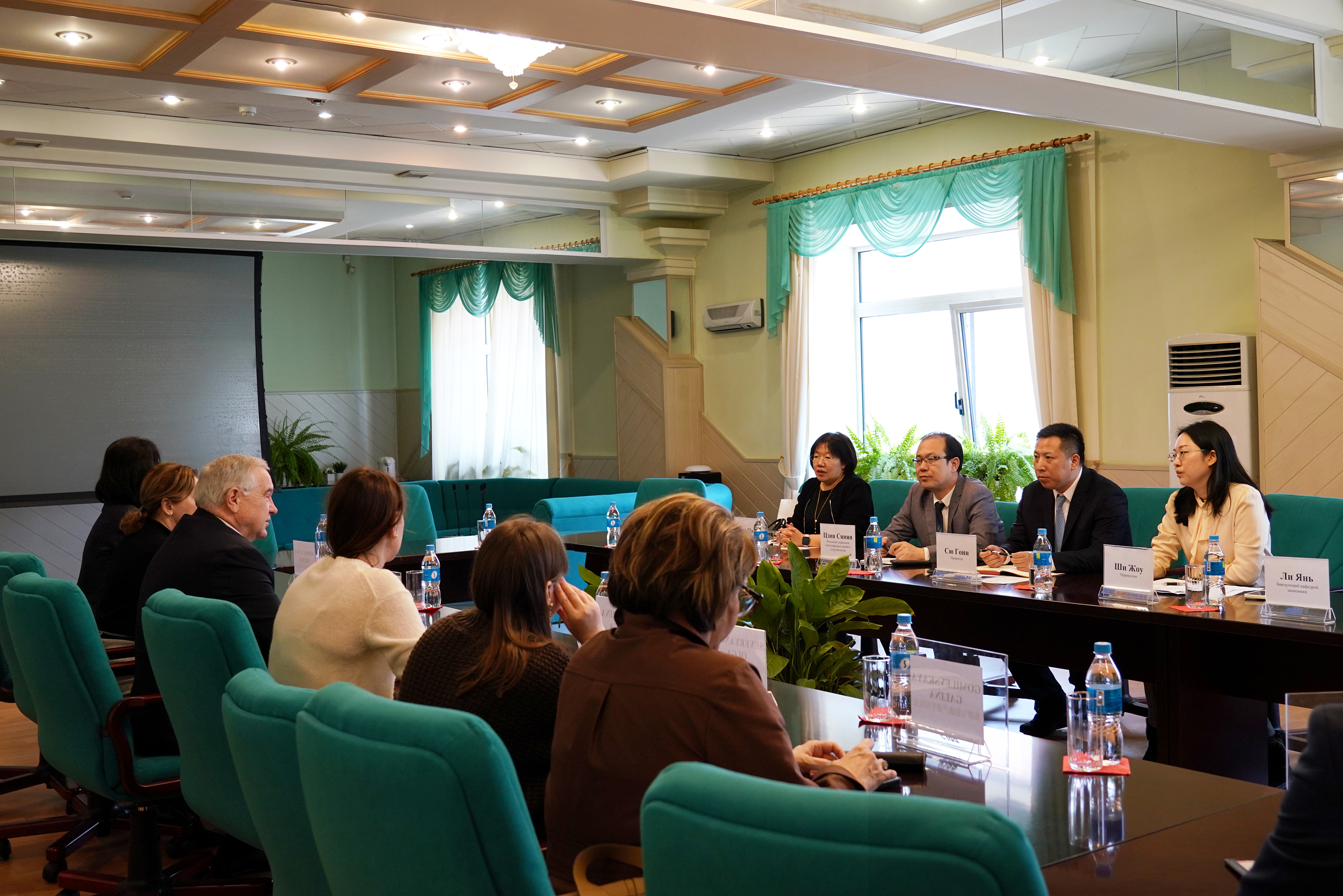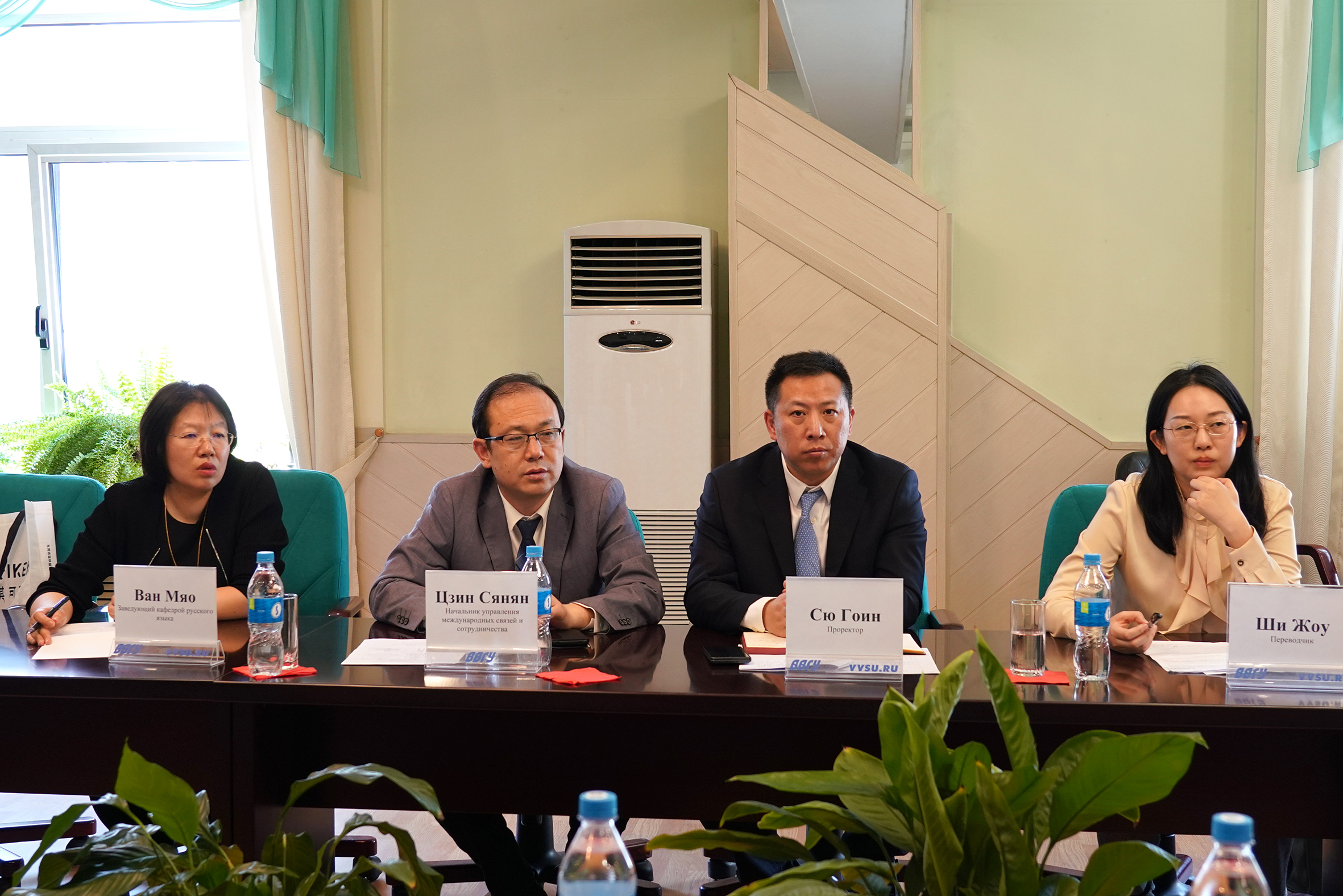 Со стороны гостей на встрече присутствовали проректор Сю Гоин, начальник управления международных связей и сотрудничества Цзин Сянян, заведующий кафедрой русского языка Ван Мяо, переводчик Ши Жоу.