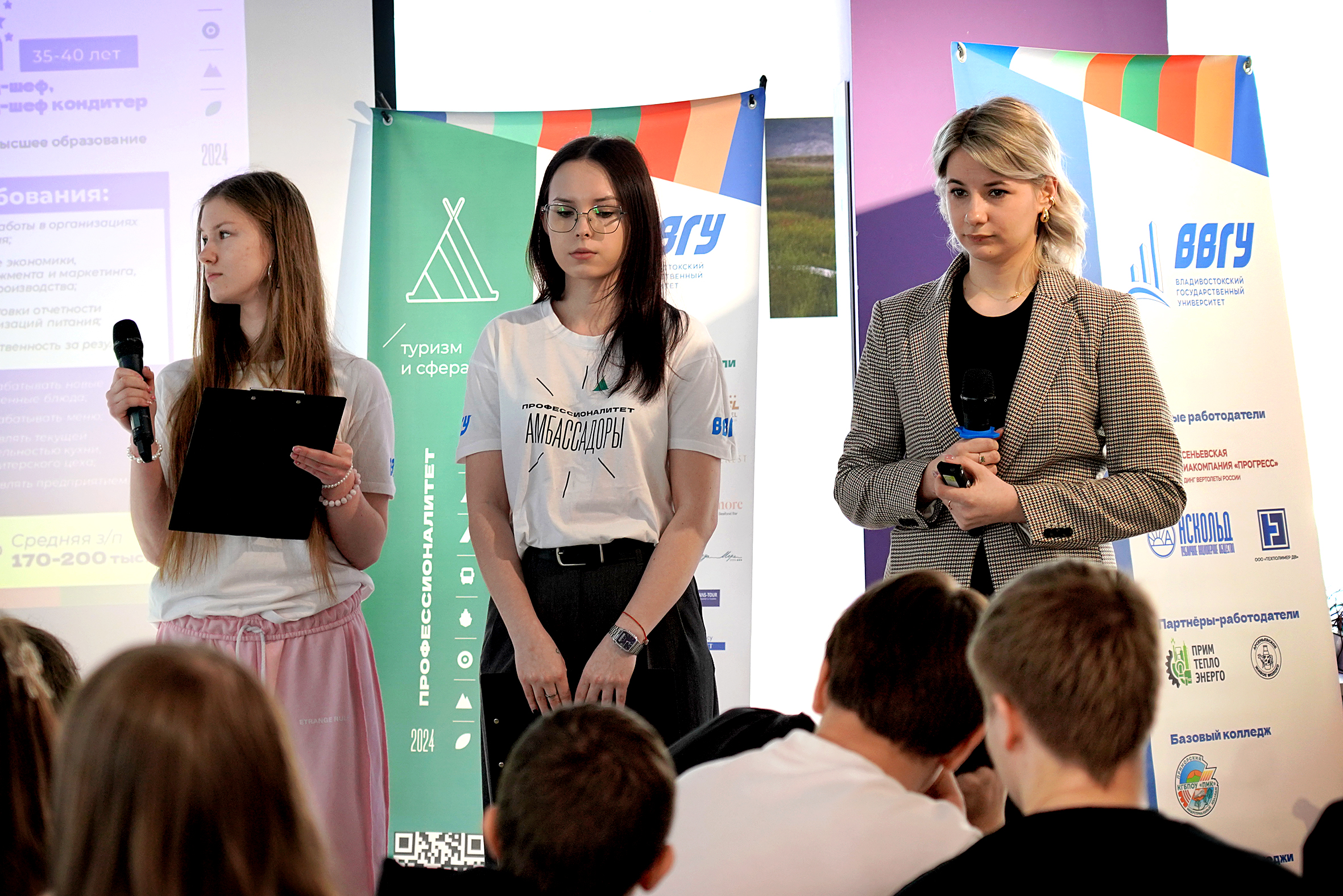 Единый день открытых дверей федерального проекта «Профессионалитет» объединил сотни школьников Приморья, их преподавателей и родителей. Мероприятие традиционно прошло во Владивостокском государственном университете – базовой организации образовательного кластера «Туризм и сфера услуг» Приморского края, а также в филиалах ВВГУ в городе Уссурийске, Артёме и Находке.