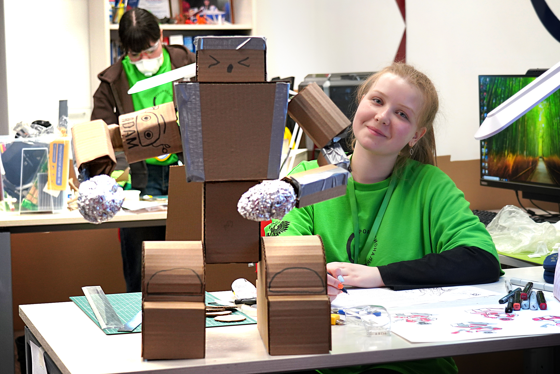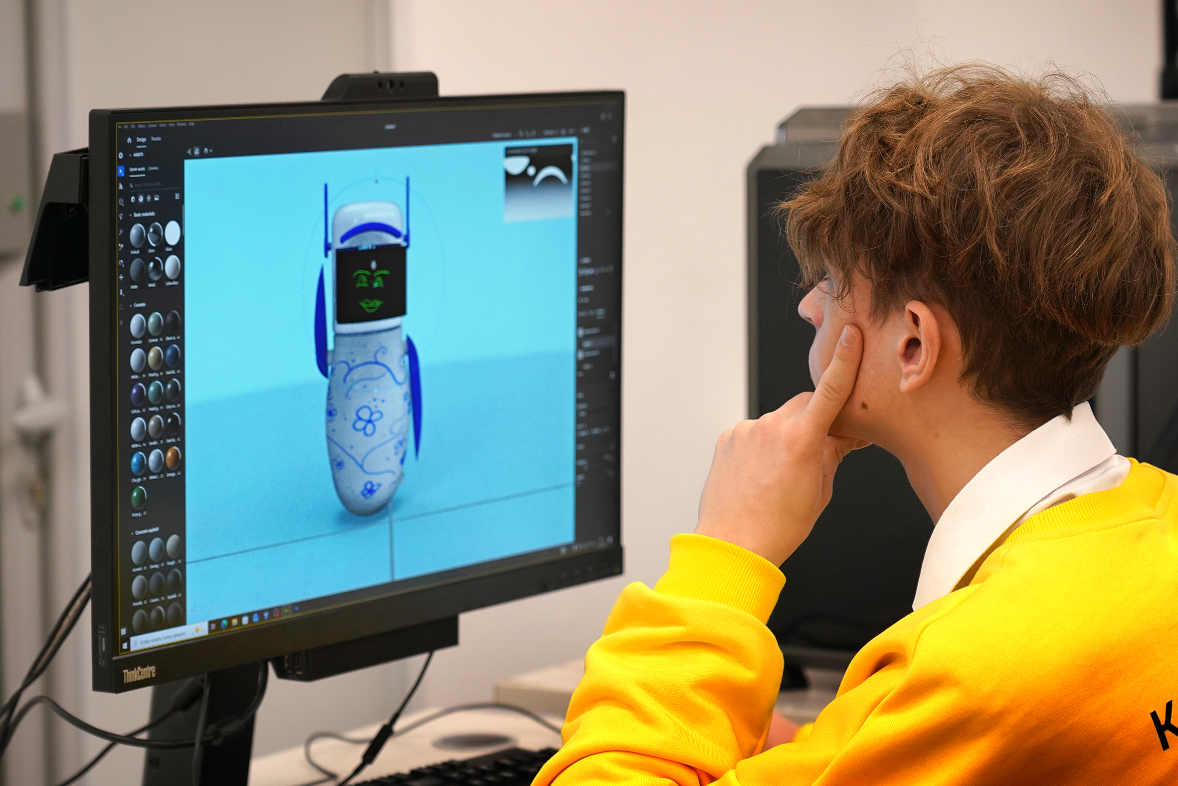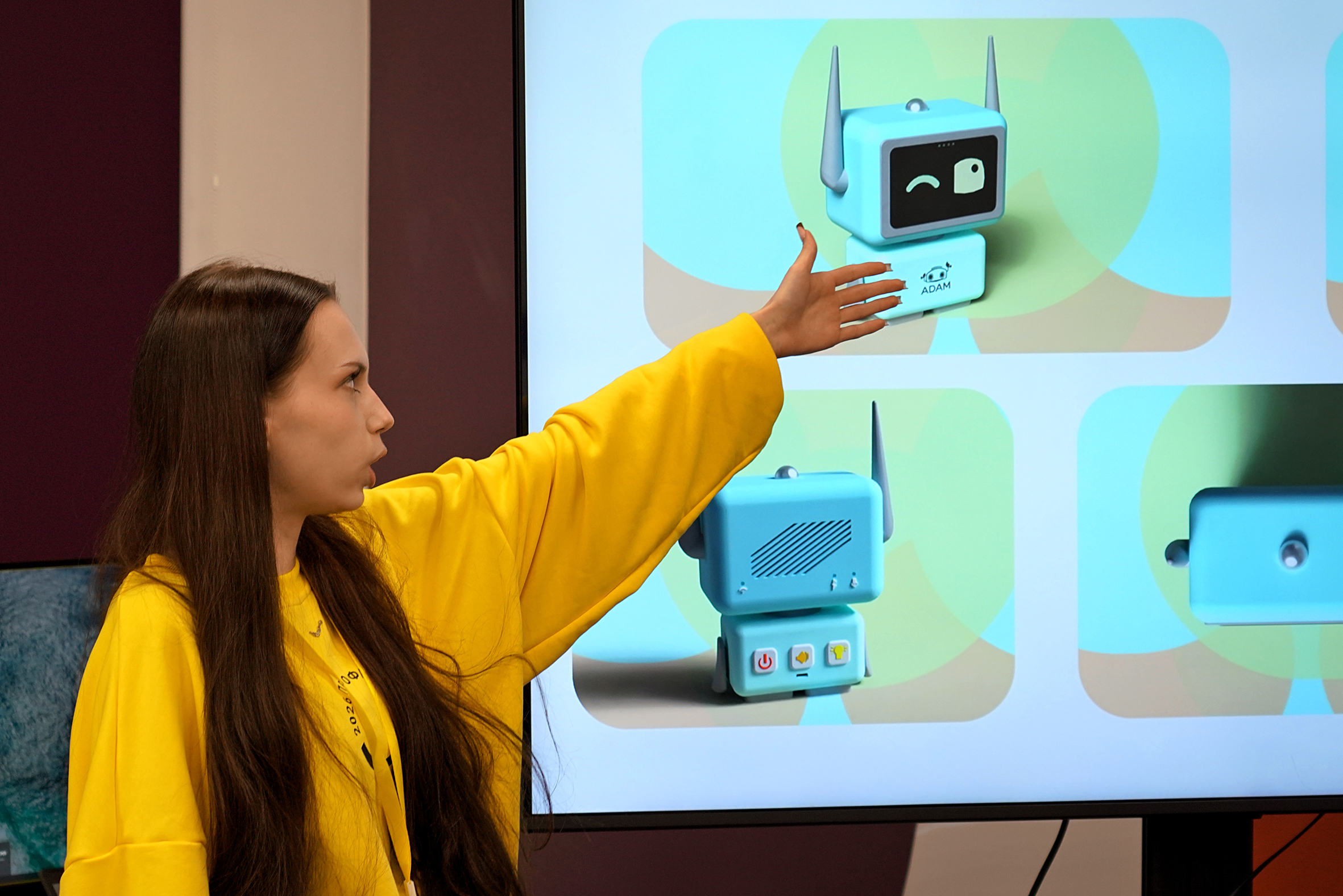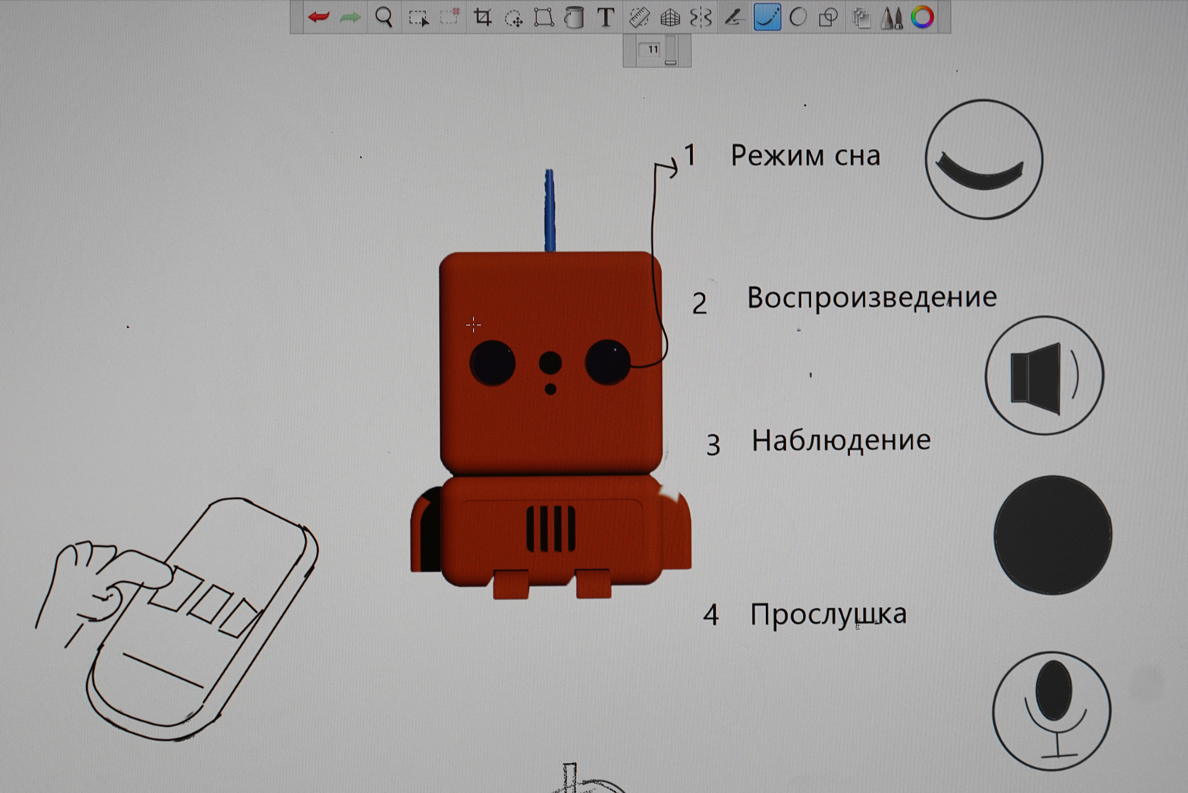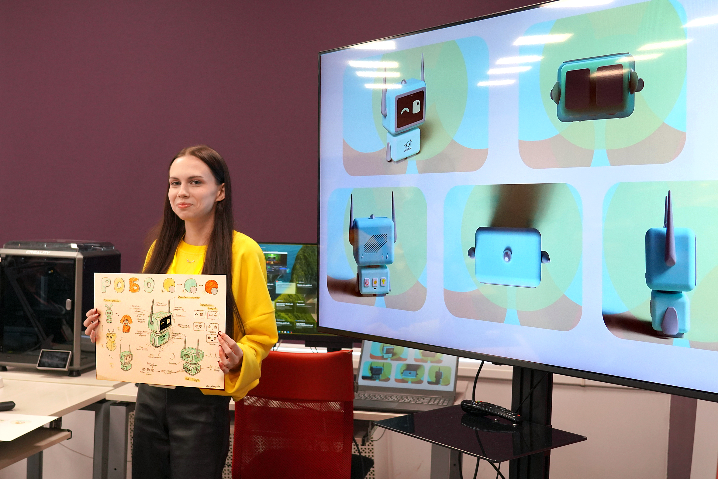 Не менее интересным было задание для младшей возрастной линейки. Юниоры разработали внешний вид интерактивного робота-видеоняни – дружелюбного персонажа для детей от 1 до 7 лет.