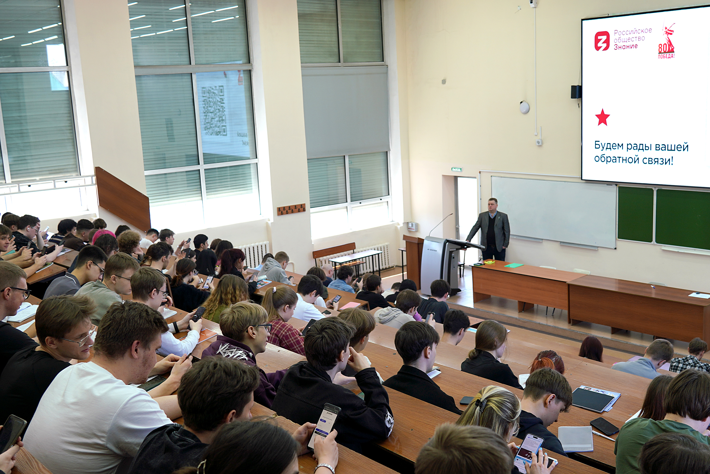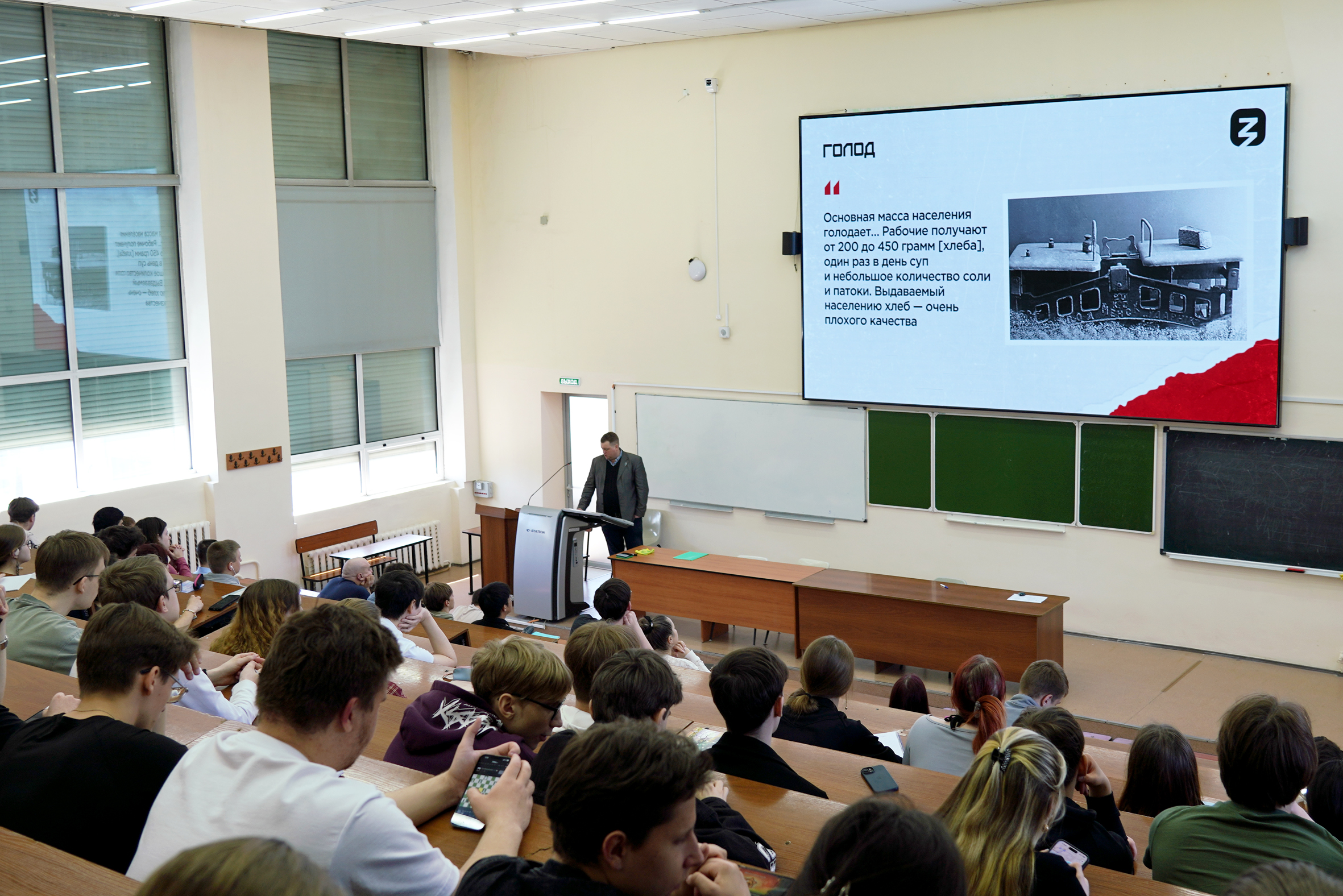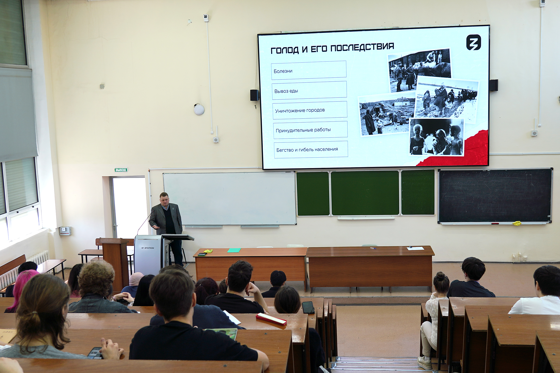 Спикер поделился со слушателями печальной историей Бабьего Яра, в котором фашисты истребили от 70 до 200 тысяч человек. Лектор упомянул и о блокаде Ленинграда, унёсшей за 872 дня более миллиона жизней. Не забыл Роман Гриванов и о героях, ковавших победу на фронте и в тылу. Так, он рассказал студентам о знаменитом партизанском отряде Ковпака, который совершил 100-дневный поход по оккупированной фашистами территории – уничтожил 19 вражеских эшелонов, 14 железнодорожных и 33 автодорожных моста, а также 36 полицейских участков с предателями родины.