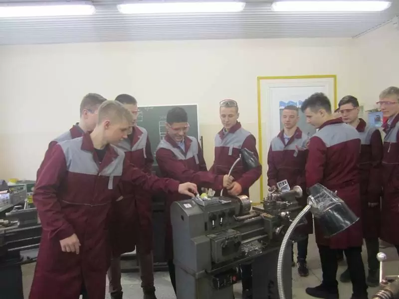 Во второй день преподаватели колледжа – мастера производственного обучения Тамара Очковская и Нина Быкова познакомили школьников с «Инструкцией по технике безопасности» при работе на токарном станке, рассказали об устройстве и функциях токарного станка, продемонстрировали этапы работы над деталью (установка и закрепление резца, наладка станка для обработки в центрах и др.) Школьники освоили элементарные (первичные) рабочие навыки и операции.