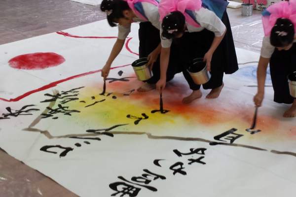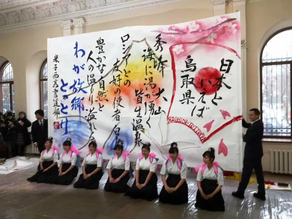 В рамках Дней культуры префектуры Тоттори во Владивосток, в частности, прибыли ученики старшей школы «Йонаго Ниси» клуба каллиграфии вместе со своим сенсеем – госпожой Ямагути Акеми (Сибата Кёкутэй). В помещении выставочного центра прямо на глазах у зрителей они создали красочное панно, символизирующее дружбу двух стран – Японии и России.