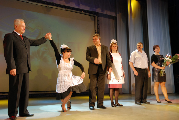 Преподавательницы лицея тоже не остались в долгу и с задором продемонстрировали такую родную для них в свое время «школьную» моду, принарядившись в стилизованные белые переднички и украсив прически белыми бантами.