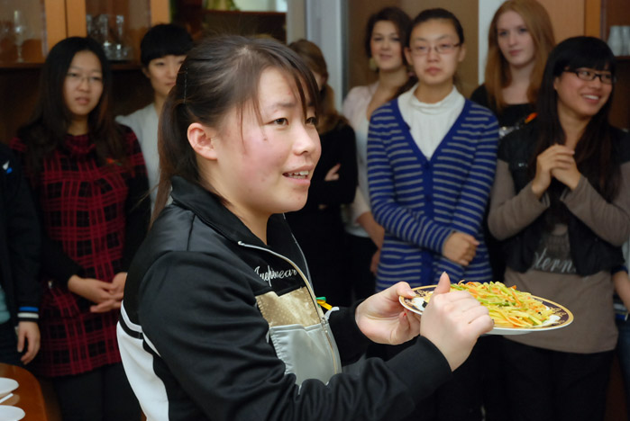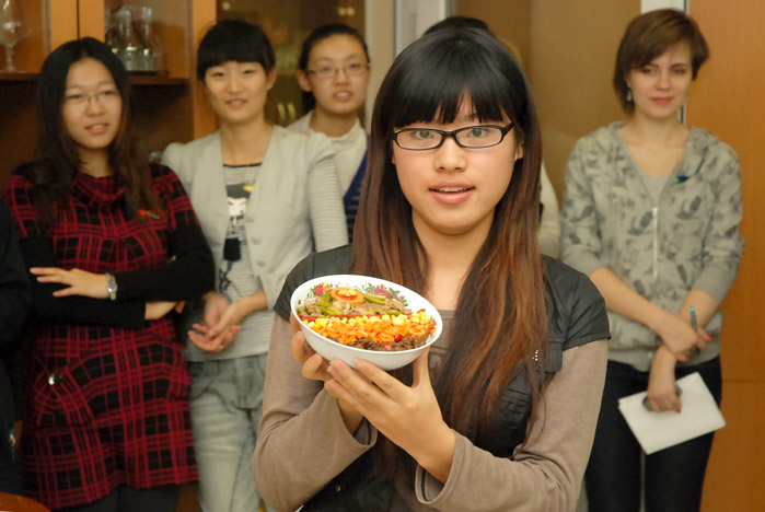 - Моё блюдо называется «Цветок»,- рассказала студентка из Китая Ван Цян. – Это салат из курицы, моркови, перца, печени, чеснока и кукурузы. Он очень красивый и полезный, ведь в нём много овощей.