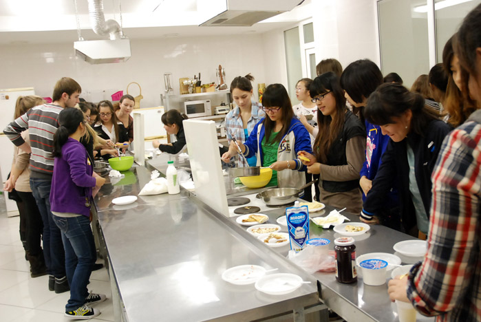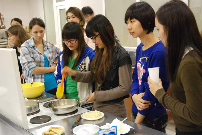 После дегустации корейской и китайской кухни ребята из России провели гостям мастер-класс по приготовлению настоящих русских блинов.