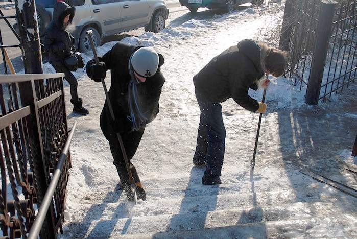 Ежедневно студенты ВГУЭС во внеучебное время в рамках социальной практики очищают скованные толстым слоем льда тропинки, лестницы и дорожки территории кампуса. Результаты работы полезны не только для сотрудников и учащихся университета. Сами ребята, трудясь на свежем воздухе, получают неплохую физическую тренировку и тренируют стойкость и выносливость. Но ВГУЭС, который заявляет о себе как о социально ответственном вузе, работает также и на благо всех жителей Владивостока. Студенты нашего университета активно очищают от предательского льда и виадук на улице Гоголя, по которому ежедневно переходят дорогу сотни горожан.